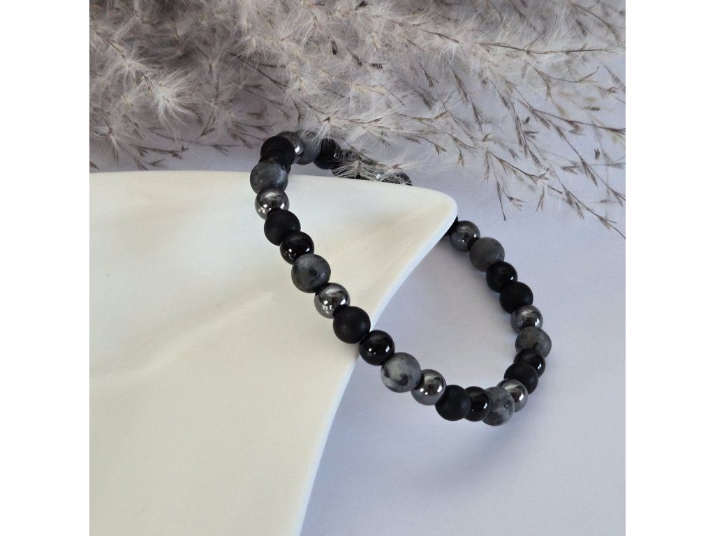 Náramek z matného labradoritu, černého onyxu, hematitu a matného achátu – 6 mm