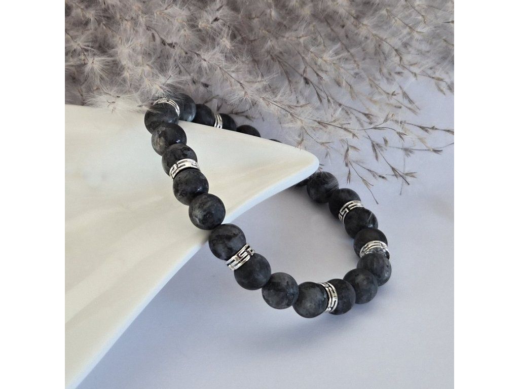 Tento náramek z matného labradoritu je symbolem elegance, klidu a přirozené krásy minerálů.