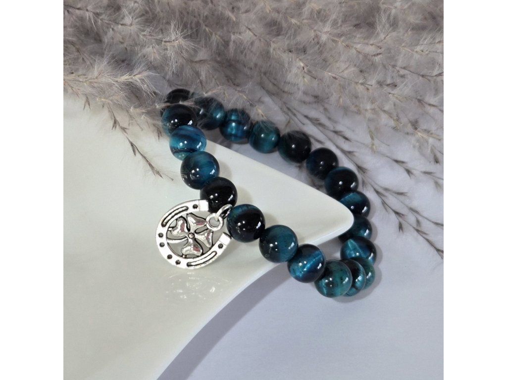 Stylový minerální náramek z modrého tygřího oka doplněný kovovým prvkem a přívěskem ve tvaru podkovy se čtyřlístkem ve stříbrném tónu. Nadčasová kombinace teplých modro / zelených odstínů a symbolu štěstí vytváří elegantní a výrazný doplněk.
