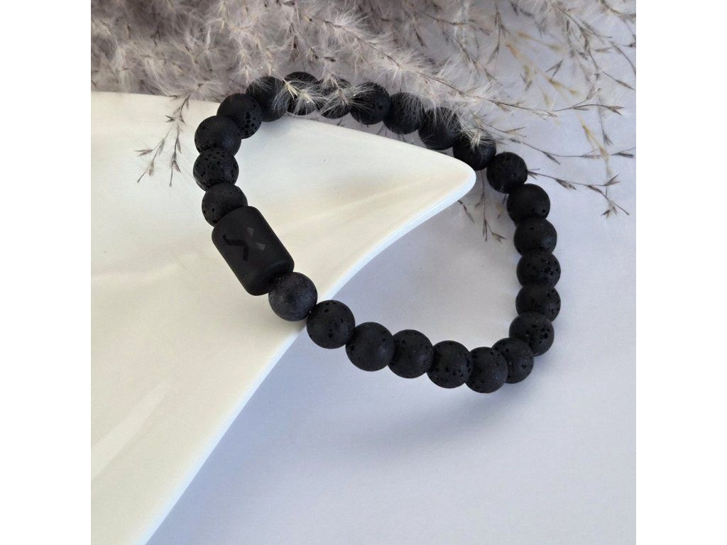 Stylový minerální náramek v čistě přírodním provedení. Černé kamenné korálky s jemně porézní strukturou působí autenticky, zemitě a zároveň velmi moderně. Dominantním prvkem je matný korálek se symbolem, který dodává náramku osobitý detail.