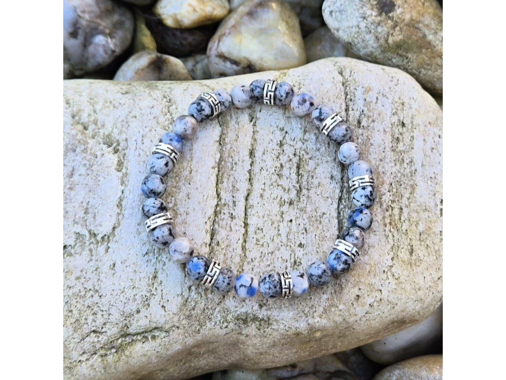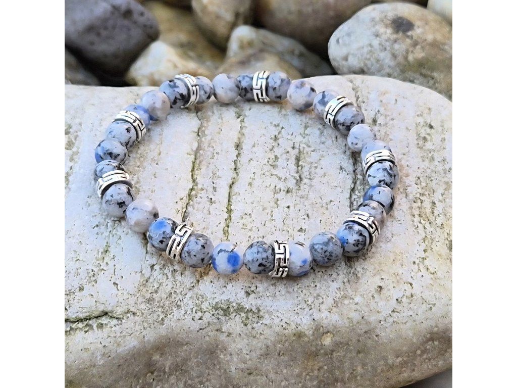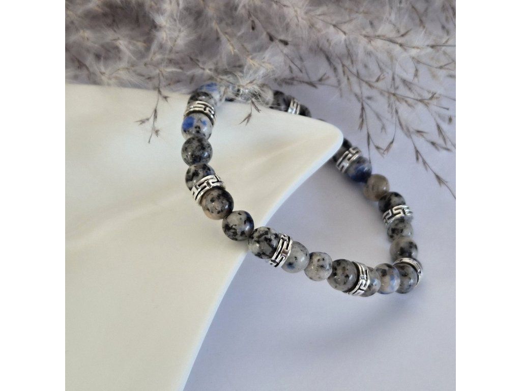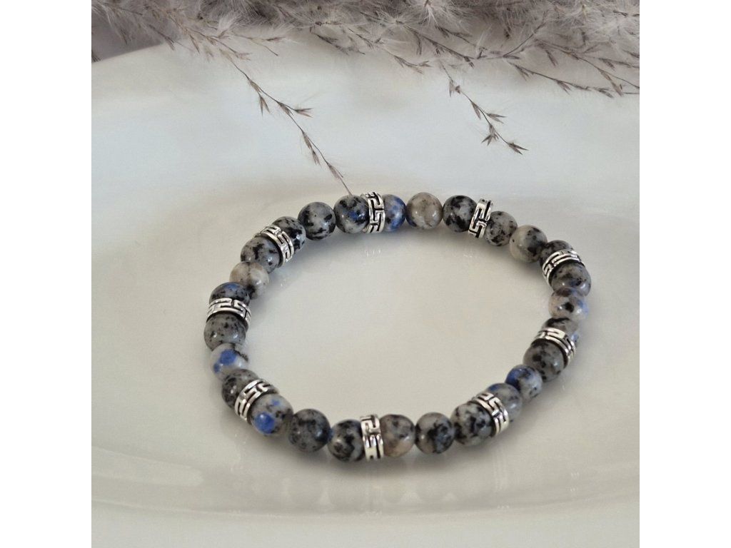 Elegantní minerální náramek z přírodního kamene K2 granit, charakteristického jedinečnou kombinací šedého granitu s výraznými modrými skvrnami. Minimalistický design doplňují kovové mezidíly ve stříbrném tónu, které dodávají šperku moderní a čistý vzhled.