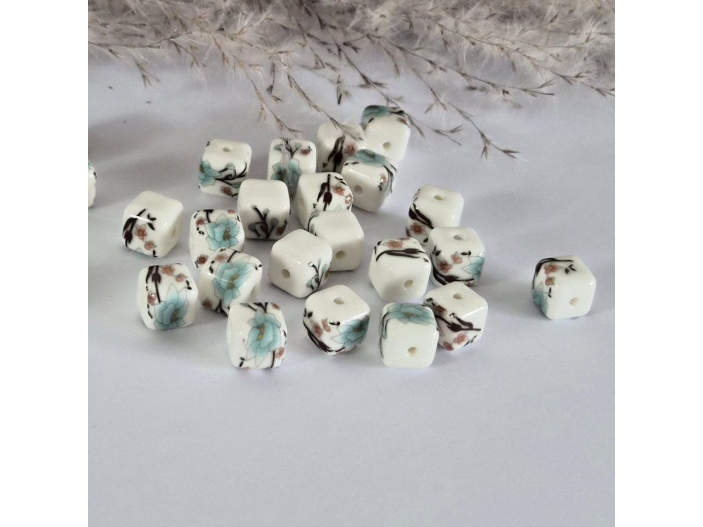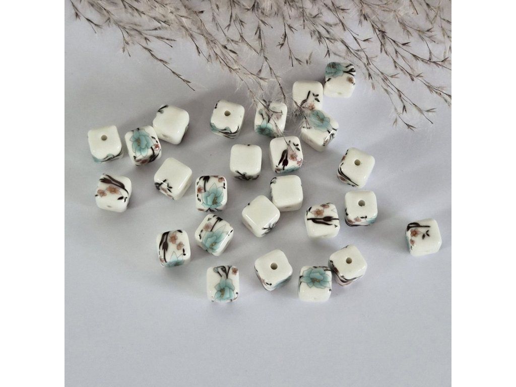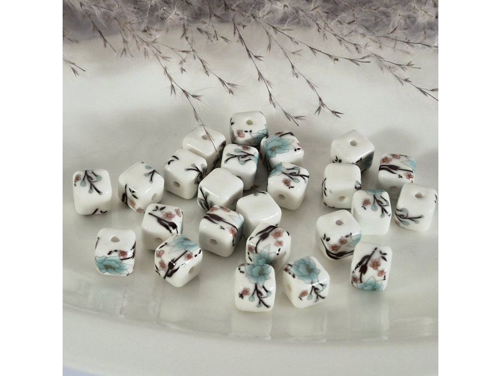 Porcelánové čtvercové korálky v jezerní modré a bílé barvě jsou ideální volbou pro šperky s jemným vintage nádechem a romantickou atmosférou.
