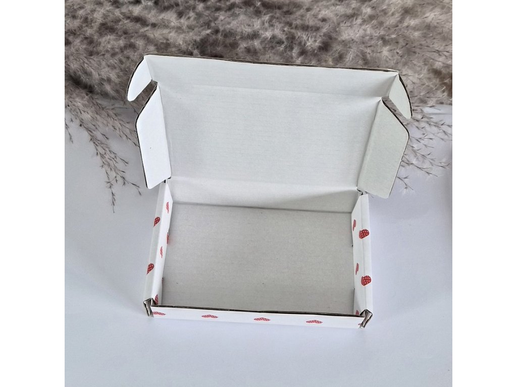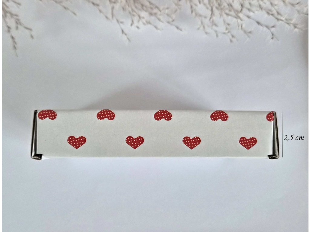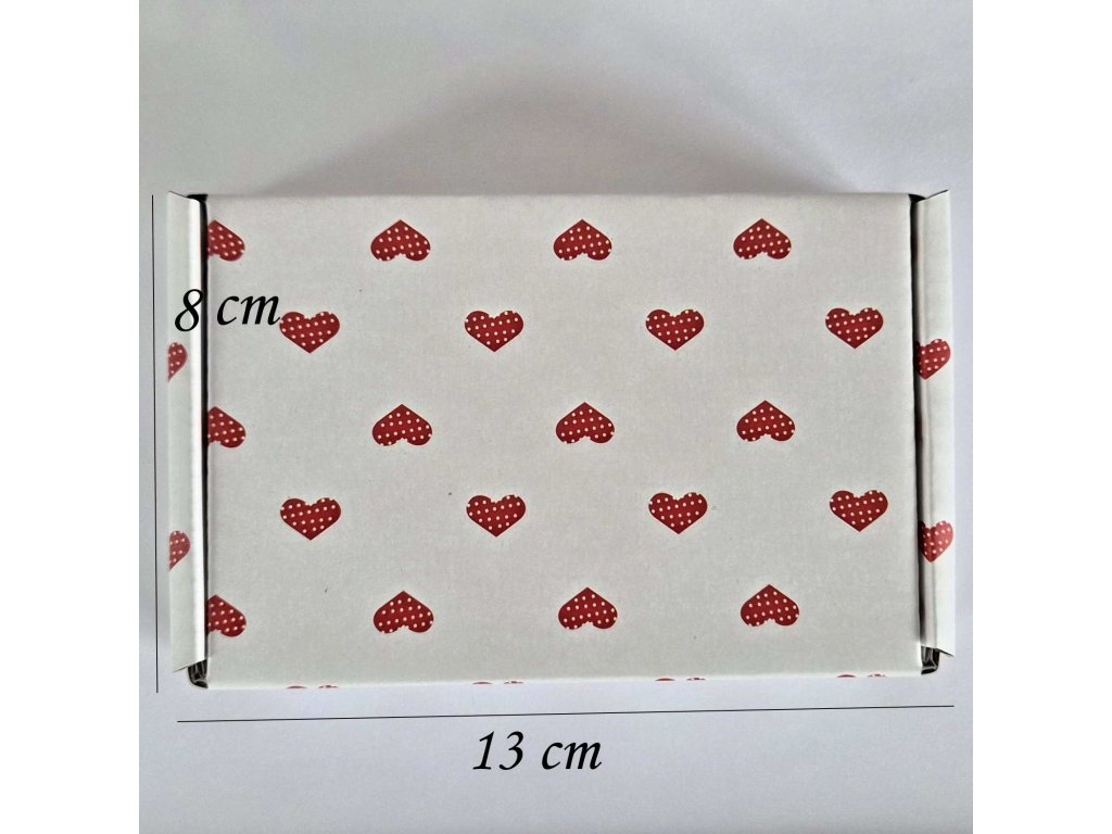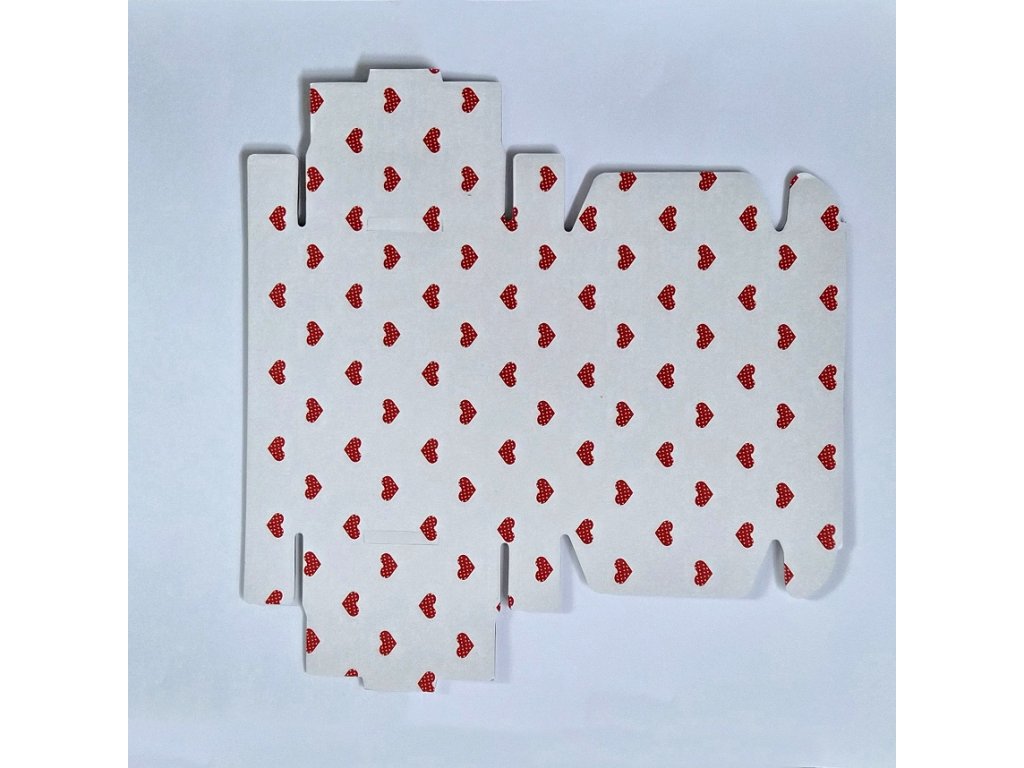 Praktická papírová krabička v jemném designu s červenými srdíčky je ideální pro balení šperků, drobných dárků nebo handmade výrobků. Jednoduché skládací provedení umožňuje rychlé sestavení bez nutnosti lepení.