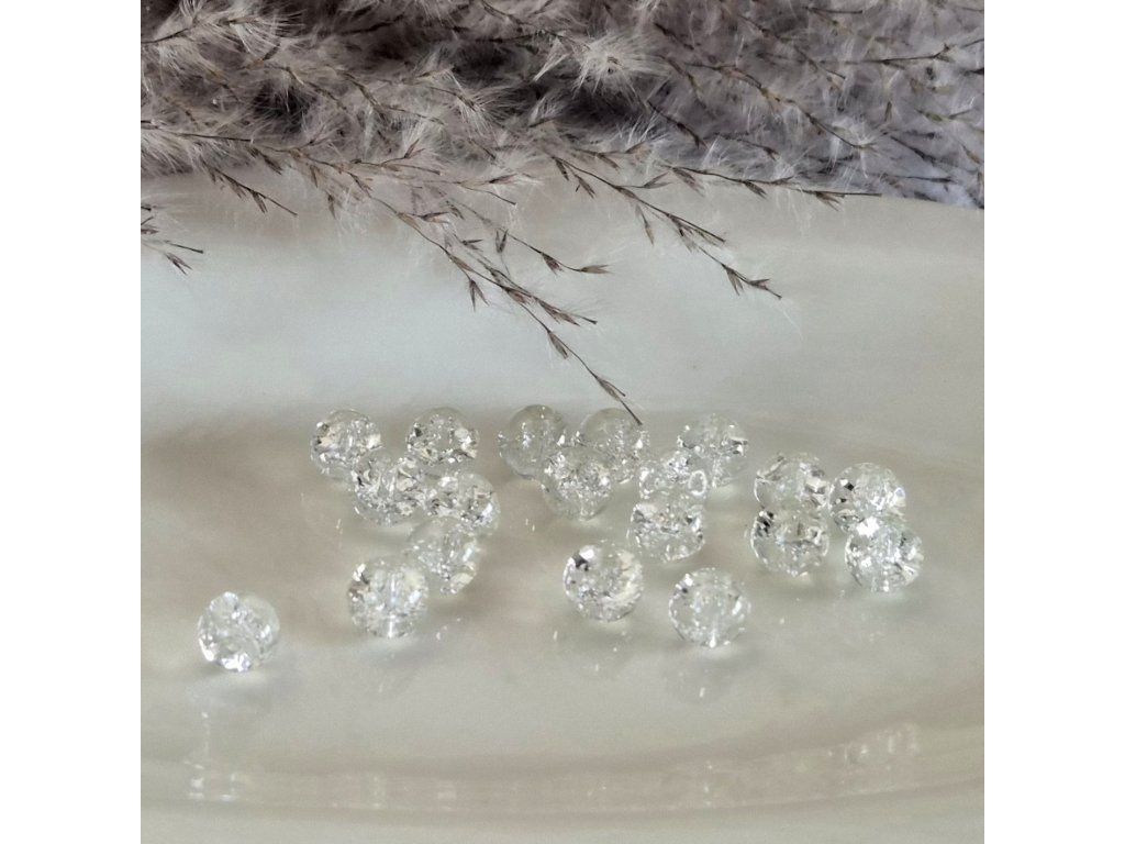 Dekorativní praskané skleněné korálky v čirém provedení. Uvnitř korálků je charakteristická struktura jemných prasklinek, která vytváří krásné světelné odlesky a dodává šperkům elegantní a třpytivý vzhled.