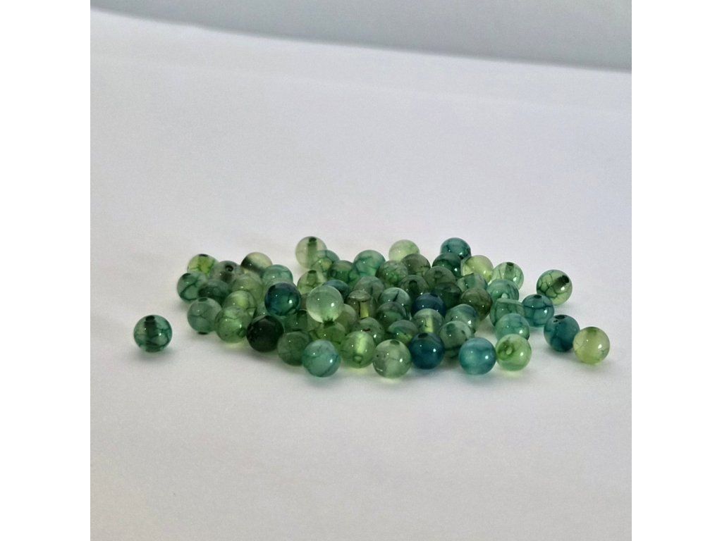 Korálky ze zeleného praskaného achátu s výraznou vnitřní kresbou. Díky tepelnému zpracování vzniká typická „crackle“ struktura, která je následně zvýrazněna barvením. Korálky jsou leštěné, hladké a příjemně lesklé.