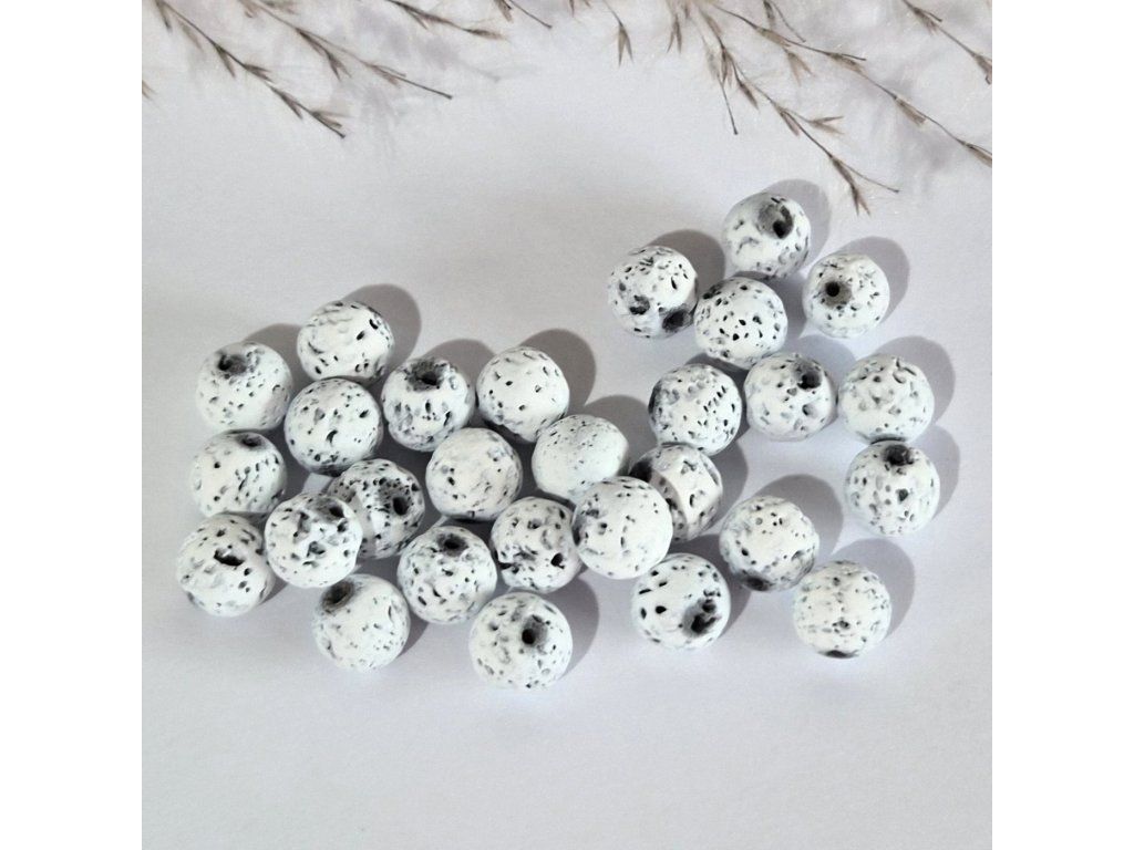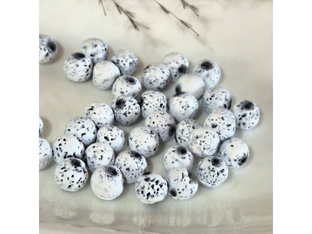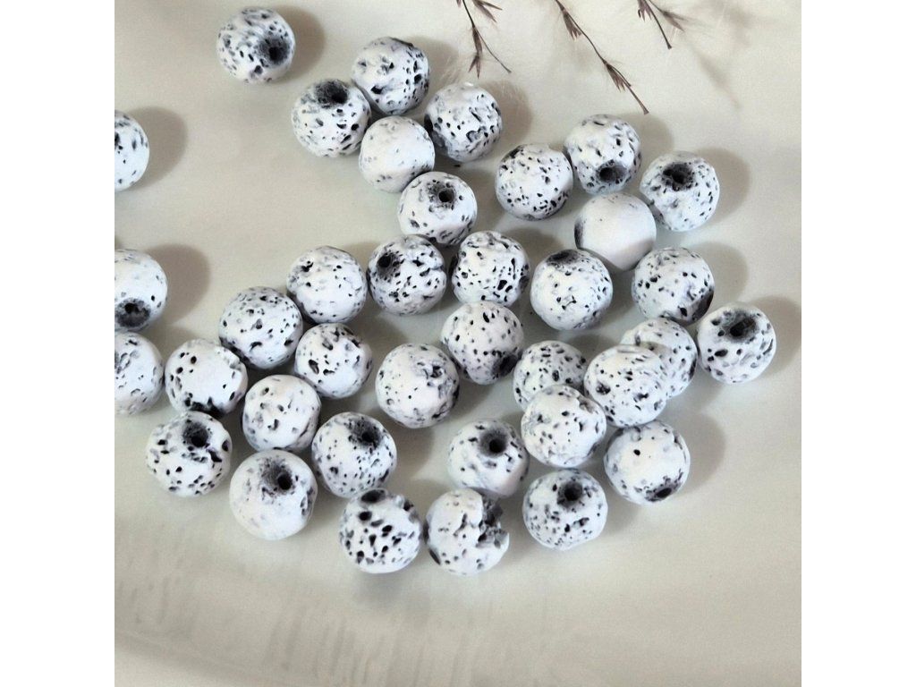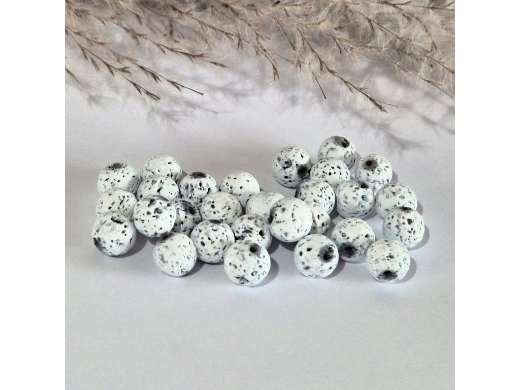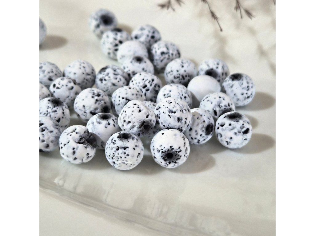 Dekorativní korálky z přírodního kamene v bílé barvě s jemným černým tečkováním. Typická porézní struktura dodává korálkům autentický přírodní vzhled, zatímco světlé provedení působí moderně a svěže. Každý korálek je originál s jedinečnou kresbou a strukturou.