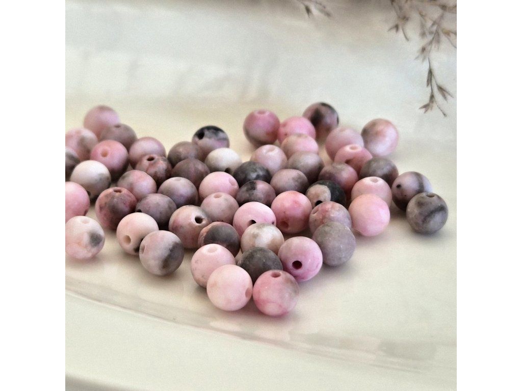 Jemné a stylové korálky z přírodního zebra jaspisu v krásných odstínech růžové doplněné šedými a tmavými akcenty. Matný povrch dodává korálkům moderní, sametový vzhled a podtrhuje jejich přirozenou kresbu.