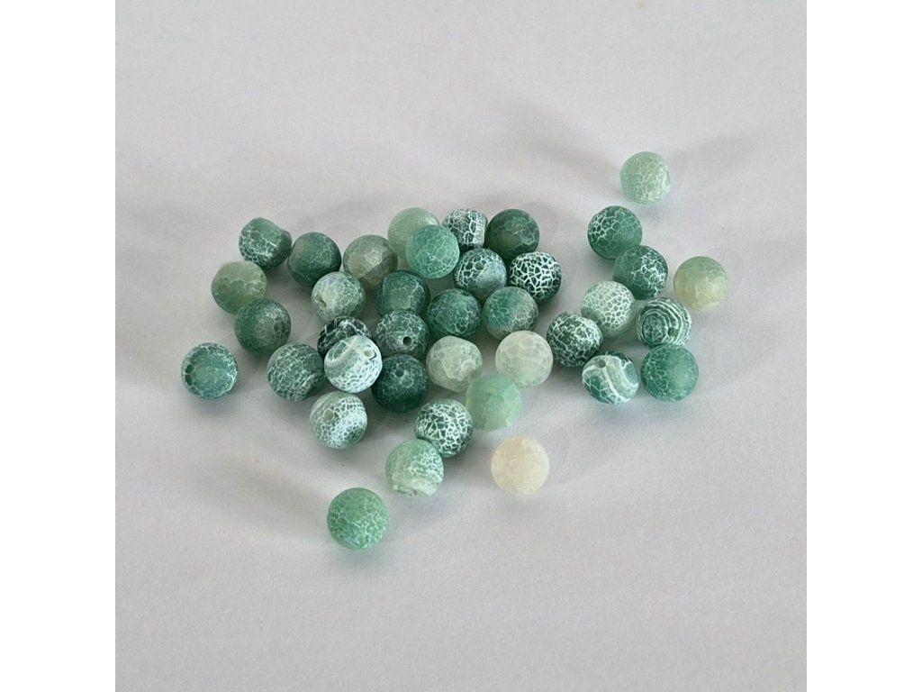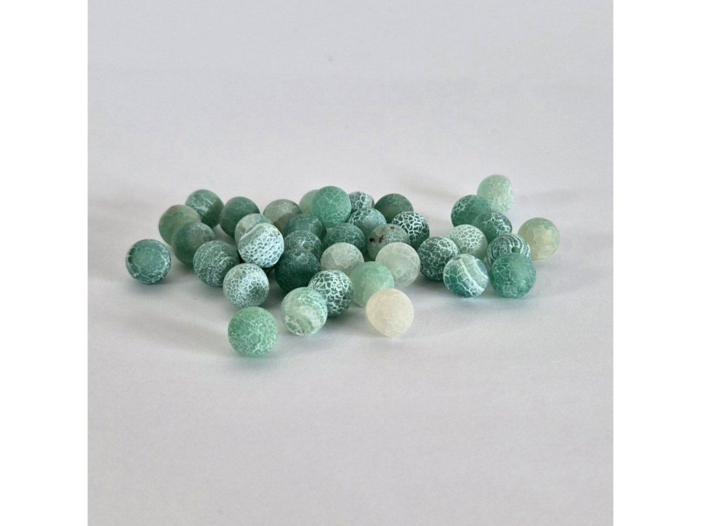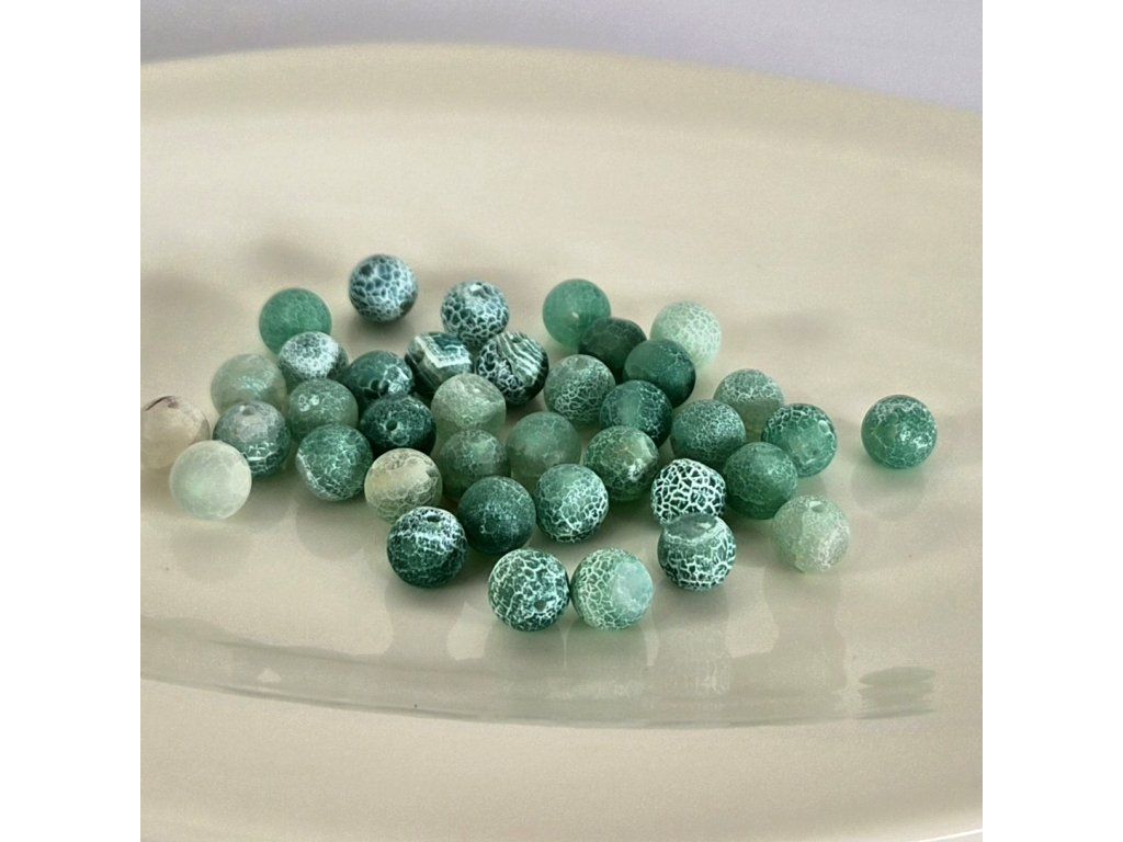 Přírodní korálky z achátu o průměru 8 mm s výraznou krakelovanou kresbou v odstínech zelené. Typická „popraskaná“ struktura vytváří zajímavý vizuální efekt, díky kterému je každý korálek originál.