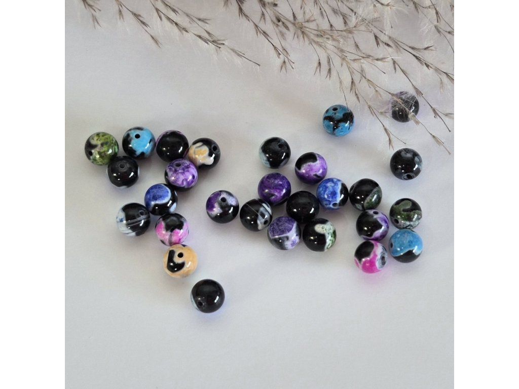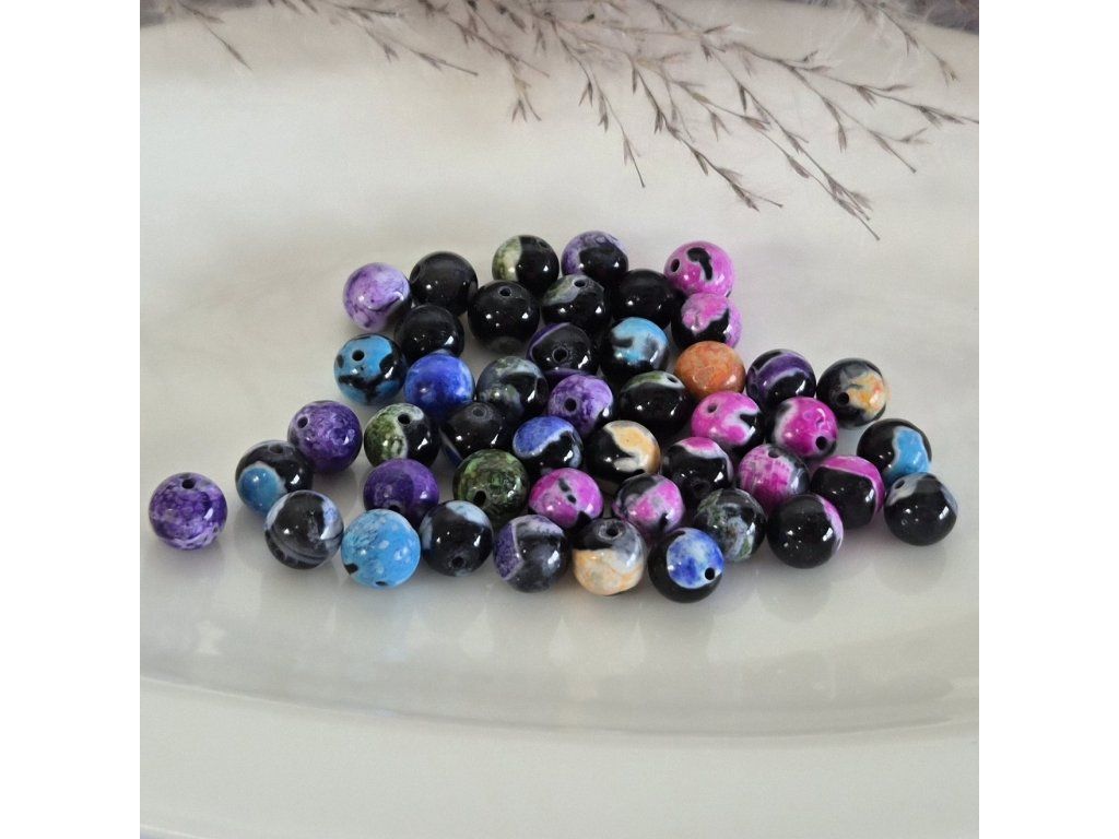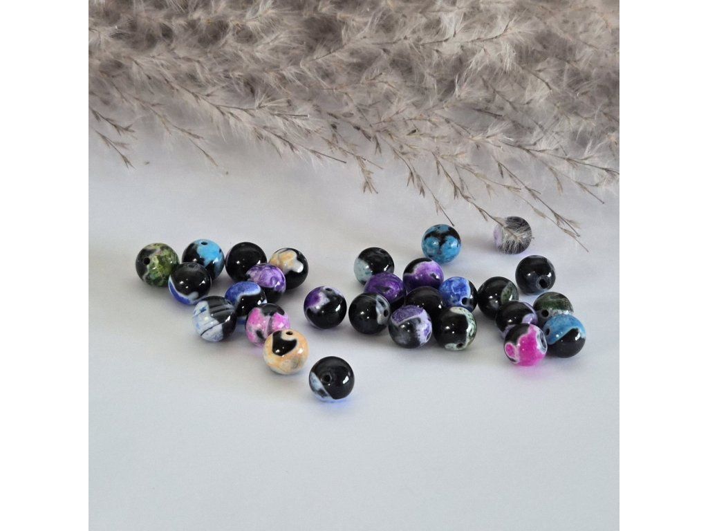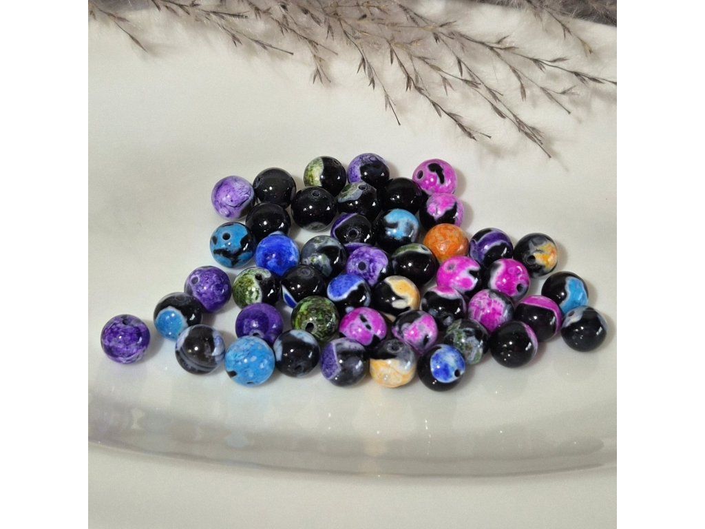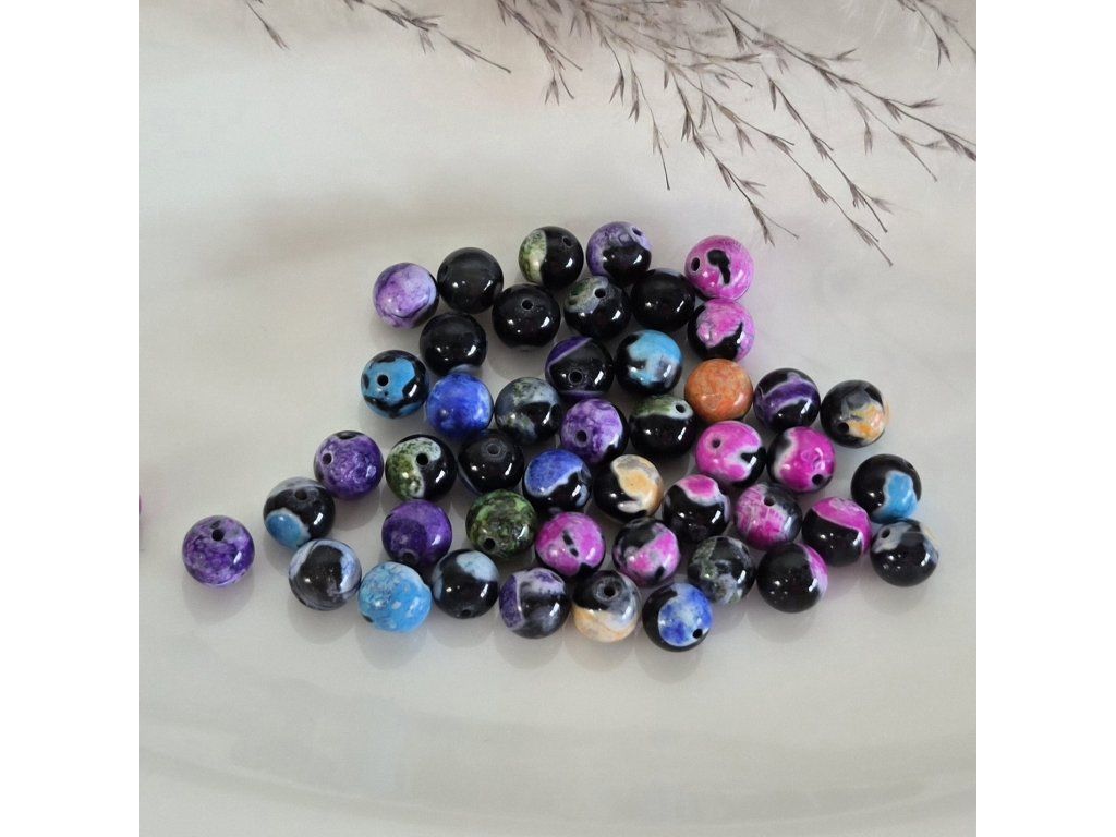Dekorativní korálky z přírodního achátu v pestré kombinaci barev – černé, růžové, modré, fialové, zelené i oranžové. Výrazné kontrasty a mramorování vytváří dynamický „ohnivý“ efekt, který působí energicky a originálně. Každý korálek je jedinečný svou kresbou a barevnou kombinací.