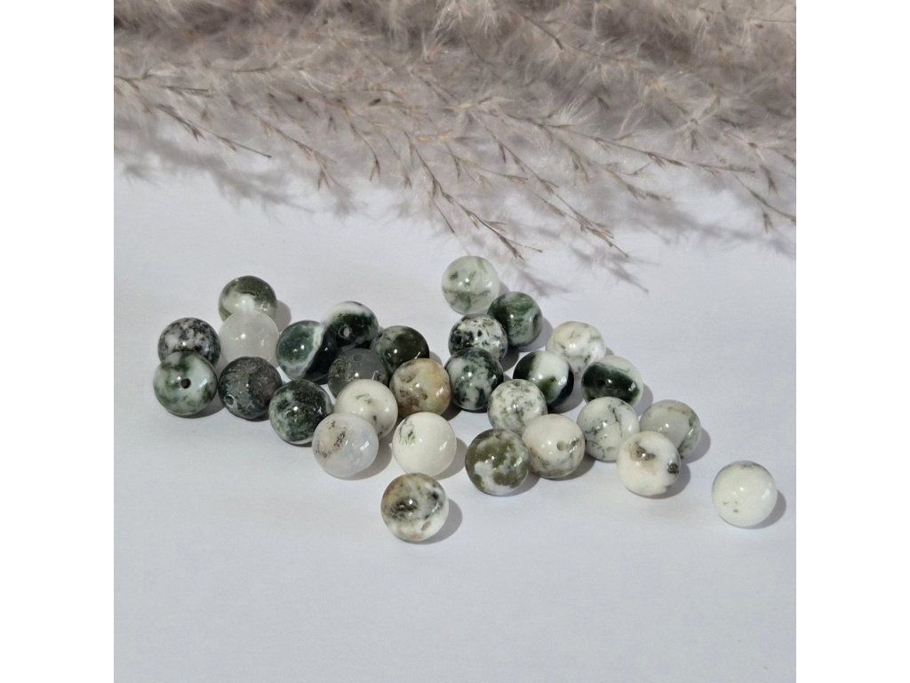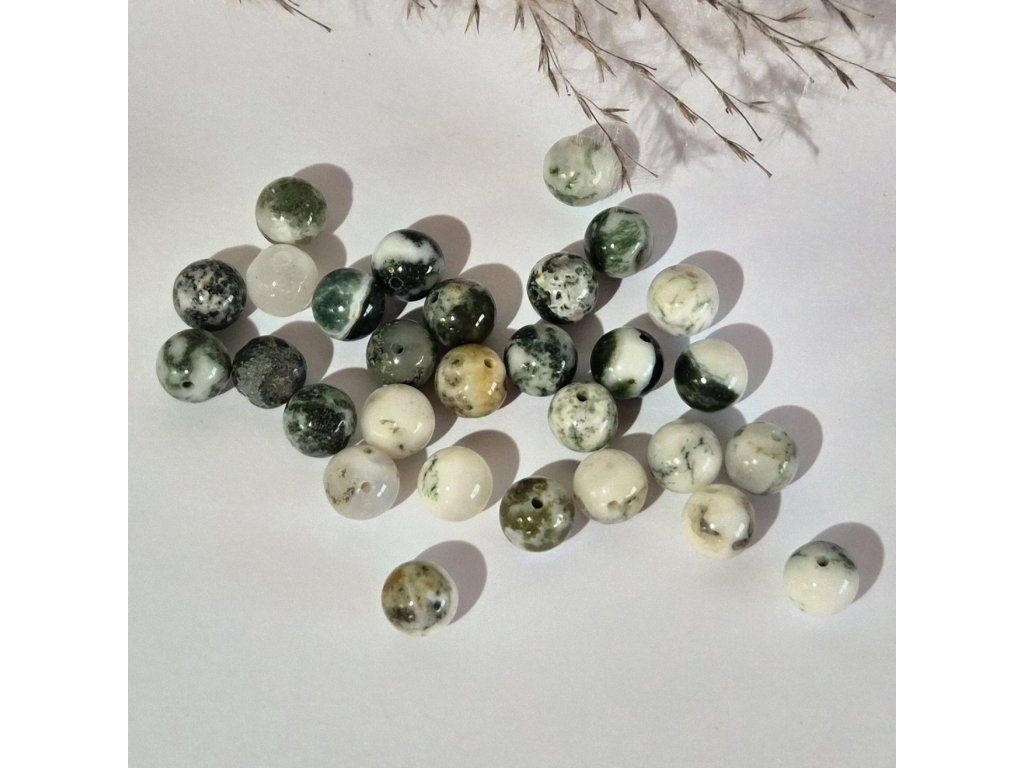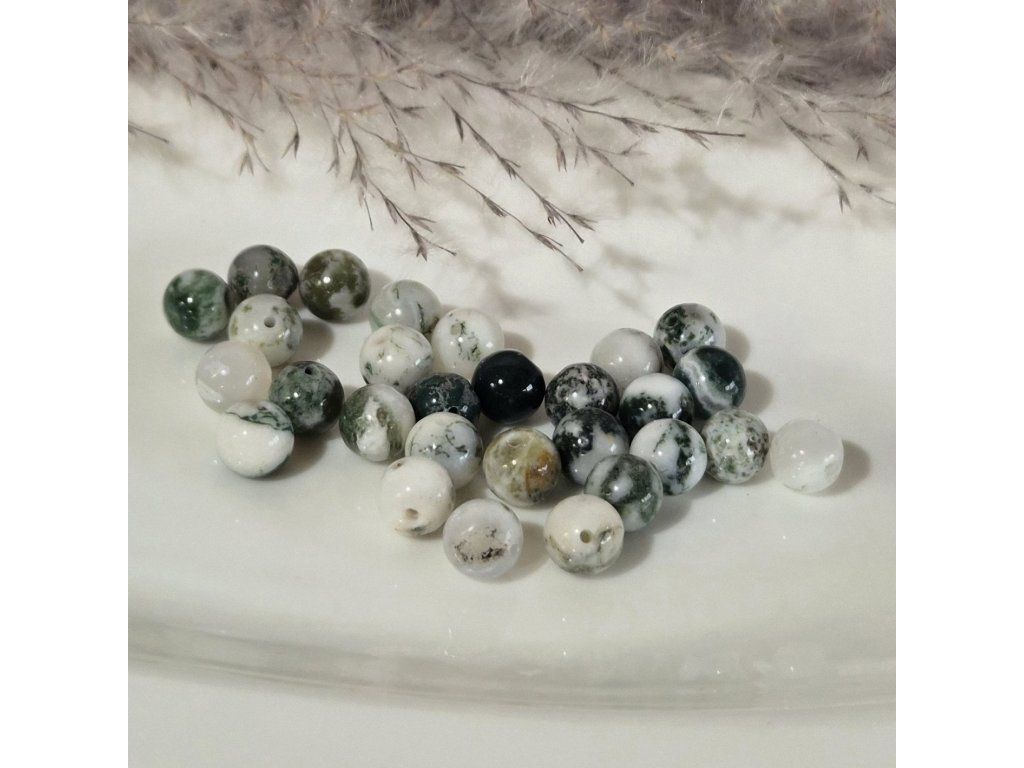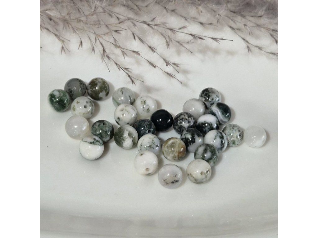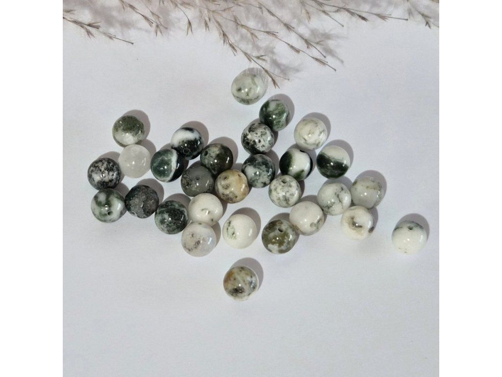 Dekorativní korálky z přírodního stromového achátu v jemných odstínech bílé, krémové a zelené. Typická kresba připomínající větvičky, mech nebo jehličí vytváří unikátní přírodní efekt inspirovaný lesní krajinou. Každý korálek je originál s vlastní strukturou a vzorem.