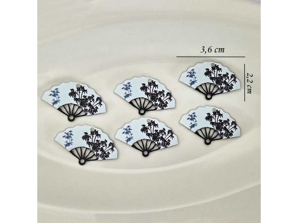Originální přívěsek ve tvaru vějíře s jemným květinovým potiskem je ideální pro výrobu výrazných, ale lehkých šperků. Kombinace černého dekoru s jemně světlým podkladem působí elegantně a nadčasově. Díky nízké hmotnosti je perfektní především na visací náušnice.