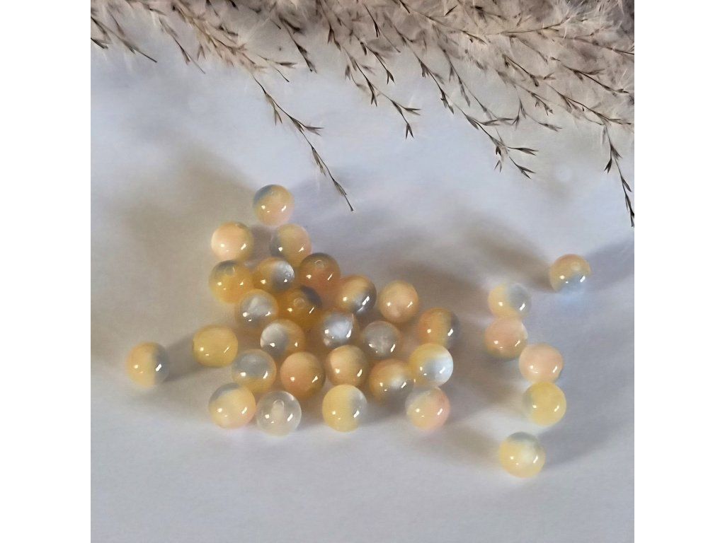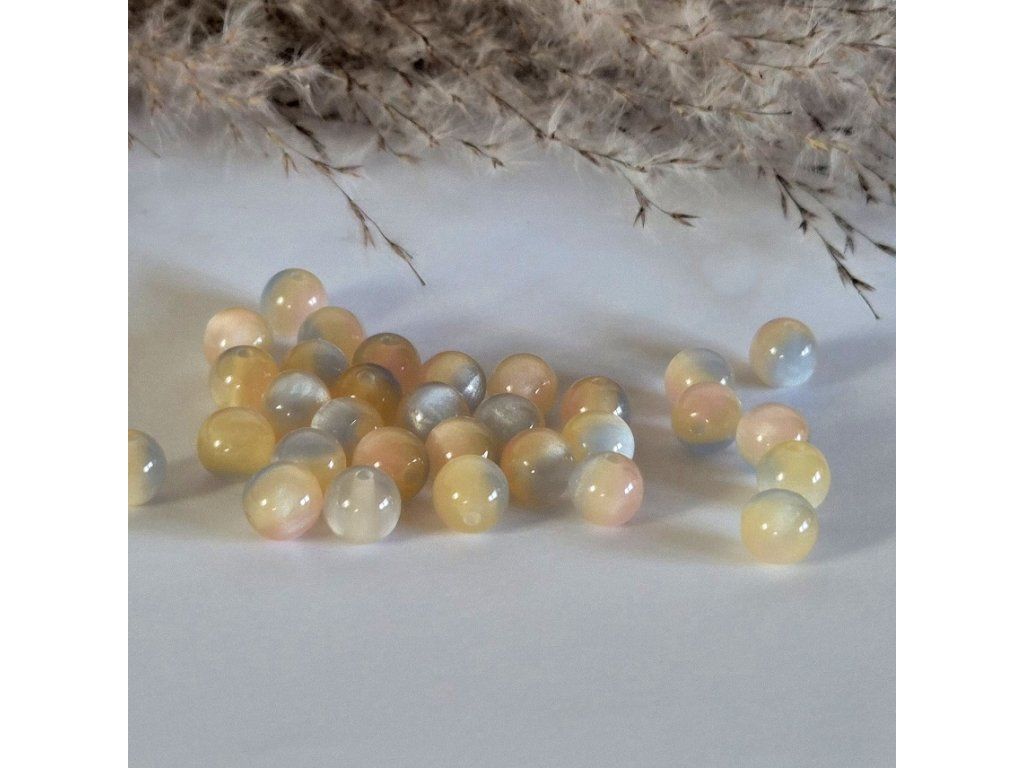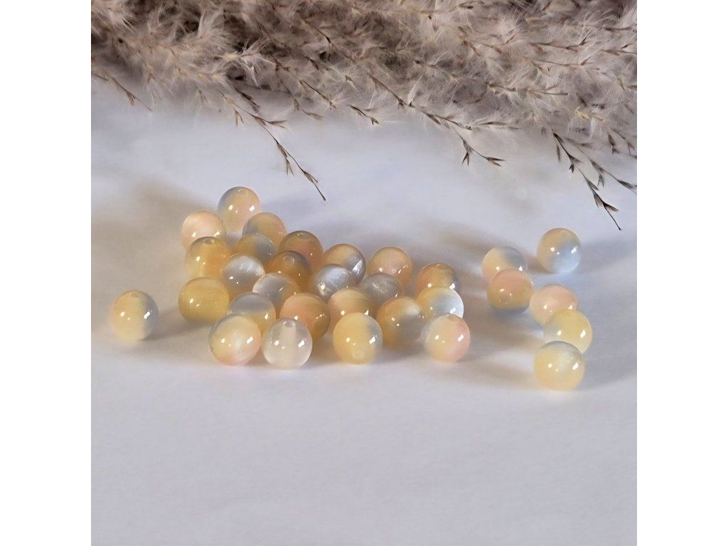 Jemné pryskyřičné korálky o průměru 8 mm v něžných pastelových odstínech žluté, meruňkové, růžové a mléčně bílé. Speciální efekt kočičího oka vytváří uvnitř korálku typický světelný pruh, který se při pohybu krásně proměňuje a dodává šperkům luxusní vzhled.