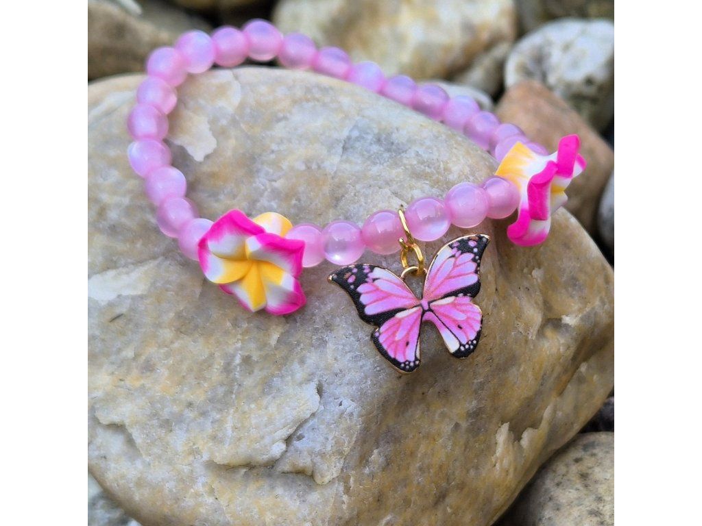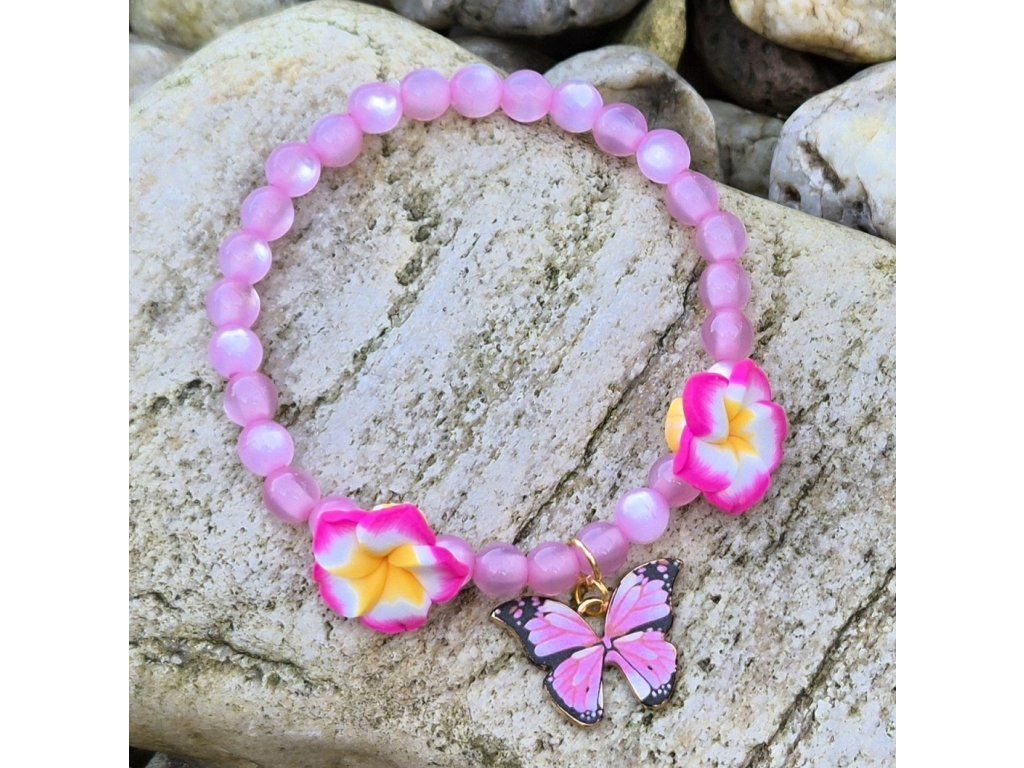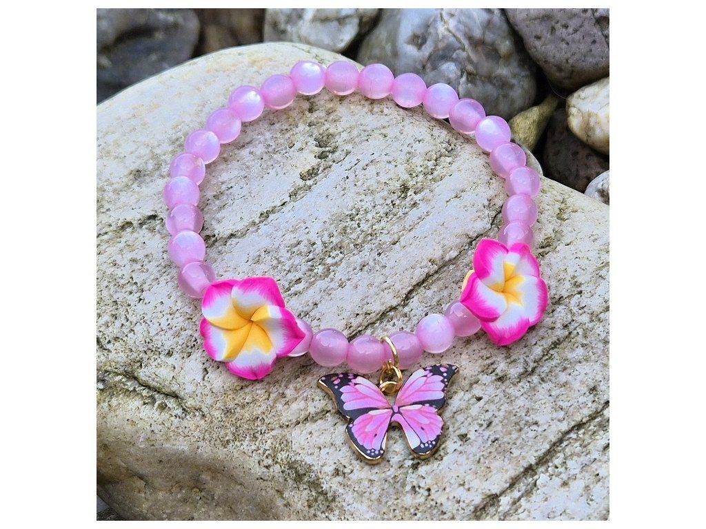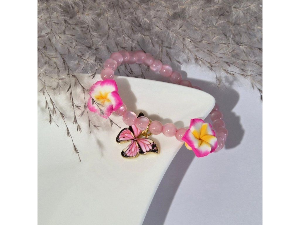 Jemný a hravý ručně vyráběný náramek v romantickém stylu, který zaujme kombinací růžových korálků, květinových detailů a dekorativního motýla. Náramek je vyroben ze skleněných korálků typu kočičí oko, které mají jemný hedvábný lesk a vytvářejí krásný světelný efekt.