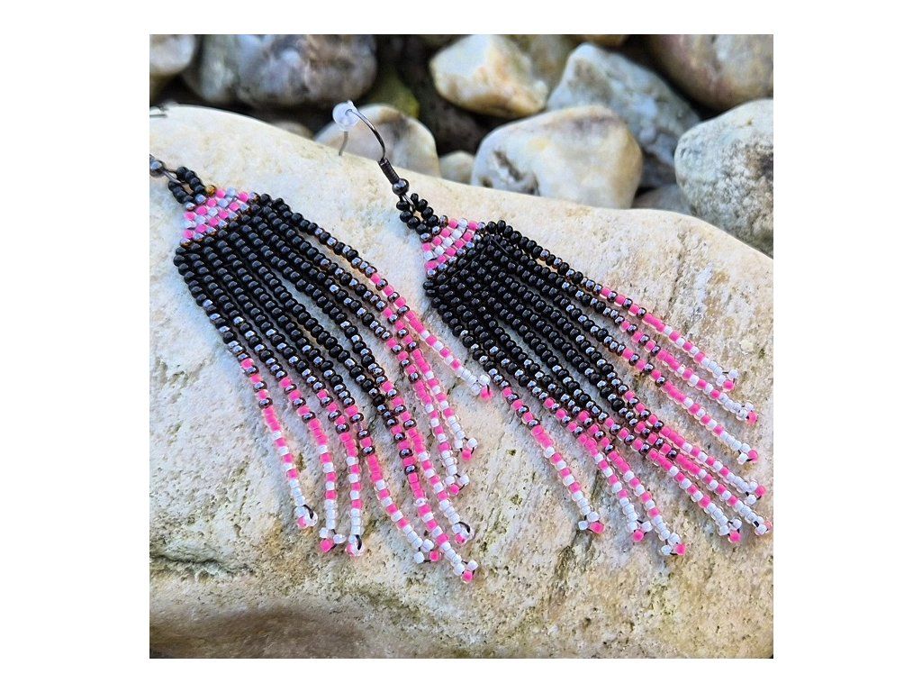 Výrazné a nepřehlédnutelné třásňové náušnice v kombinaci černé, neonově růžové a jemné bílé se stříbrnými odlesky. Kontrast tmavého základu a zářivých růžových detailů vytváří moderní a energický design.