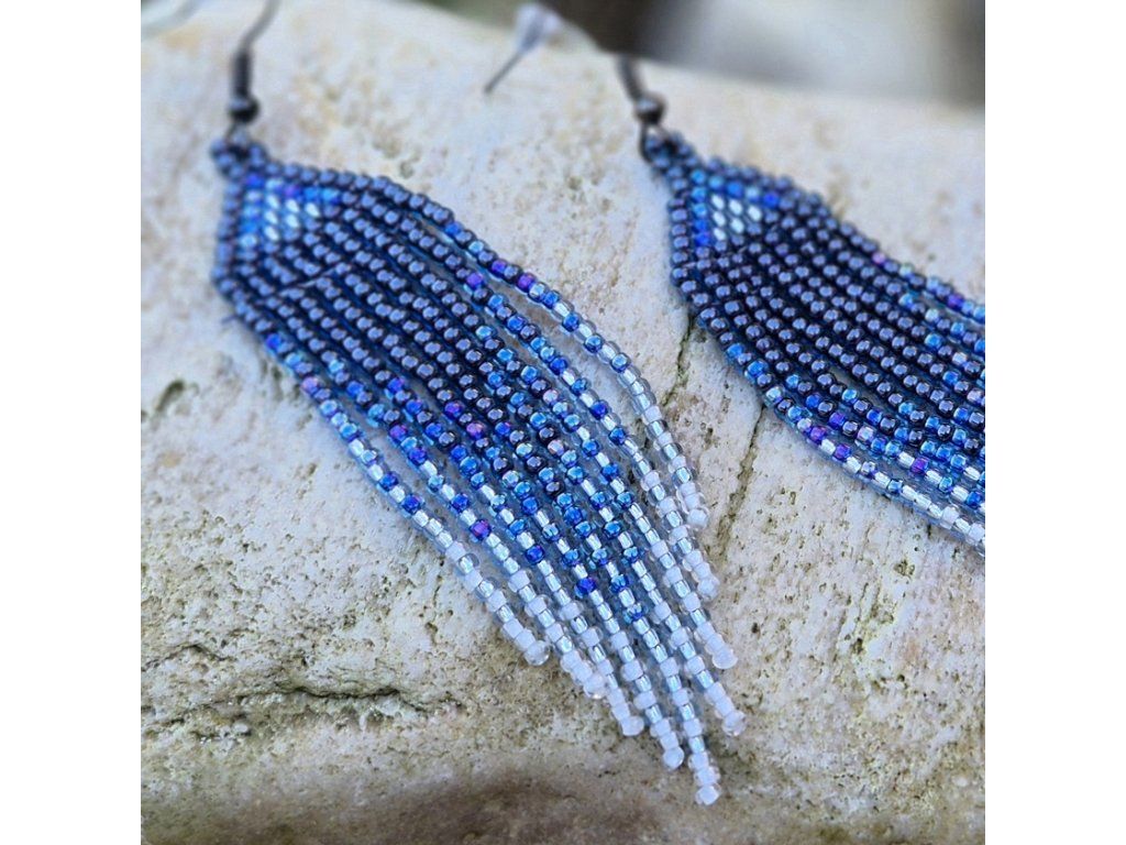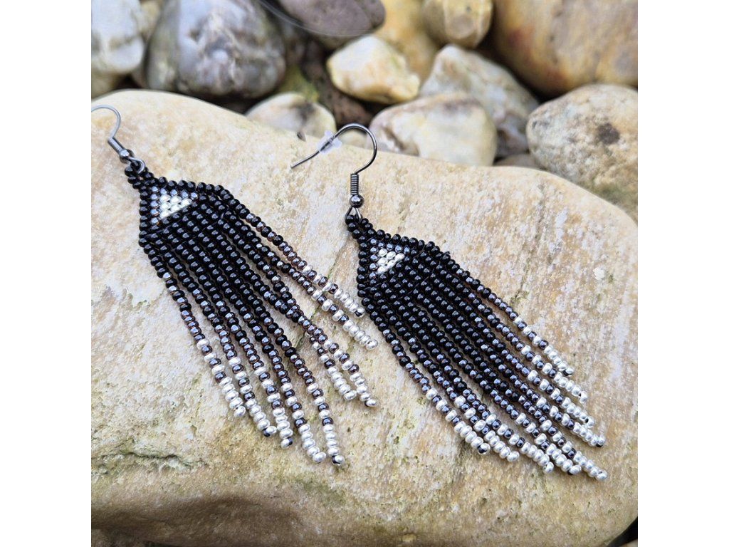 Horní část tvoří pevný trojúhelník s jemným světlým detailem uprostřed. Dlouhé třásně kombinují černé a stříbrné korálky s perleťovým zakončením, které náušnicím dodává lehkost a jemný lesk. Při pohybu se krásně vlní a odrážejí světlo.