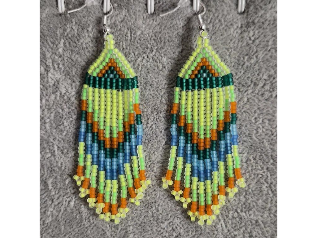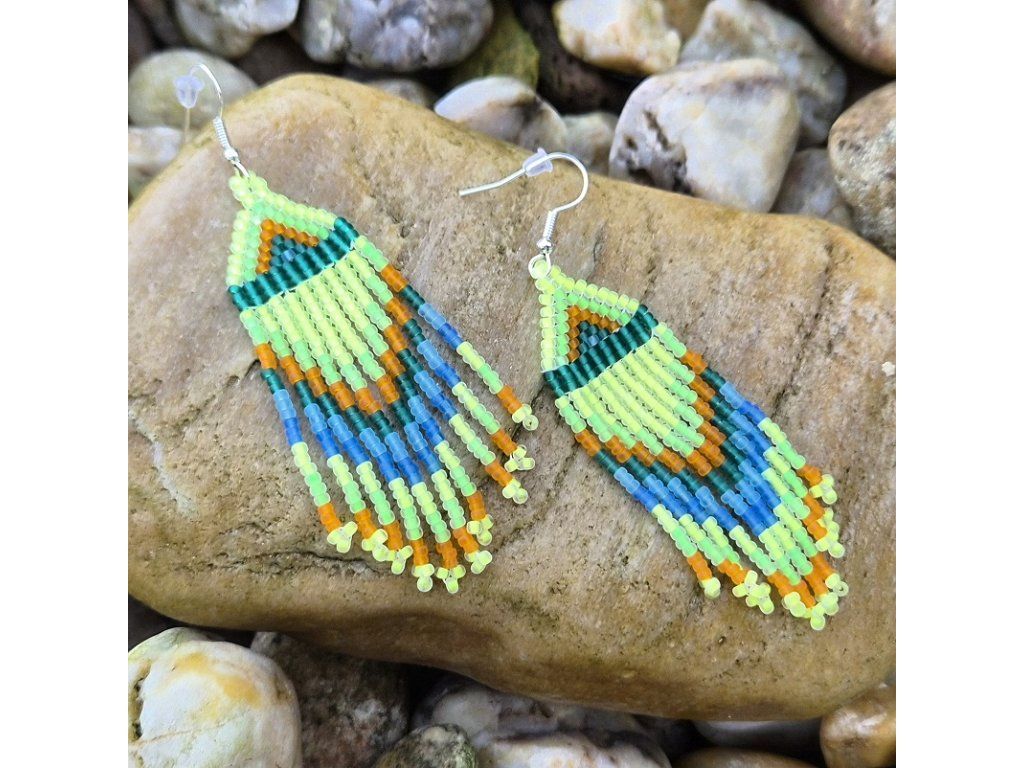 Nepřehlédnutelné, hravé a energické třásňové náušnice v zářivých neonových tónech. Kombinace svítivě zelené, tyrkysově modré, tmavě zelené a oranžové vytváří výrazný geometrický vzor s moderním nádechem.