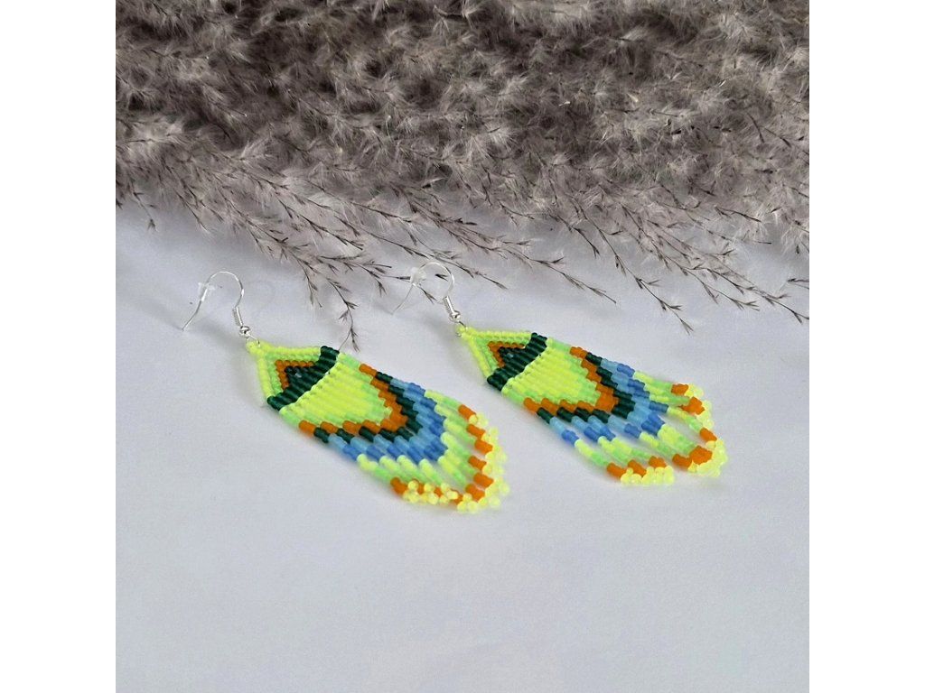 Ručně šité třásňové náušnice z korálků MIYUKI 11/0 – neonově zelená s modro-oranžovým akcentem