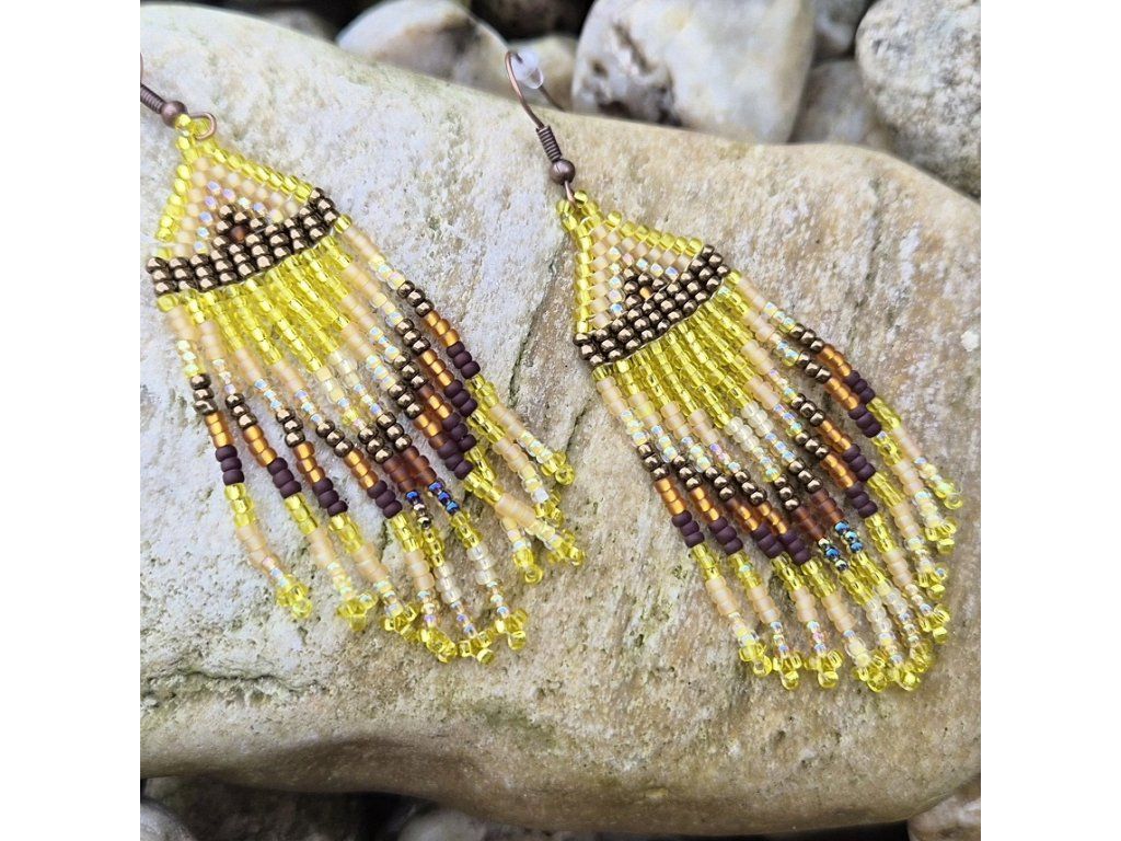Ručně šité třásňové náušnice z korálků MIYUKI 11/0 – žluto-hnědá kombinace