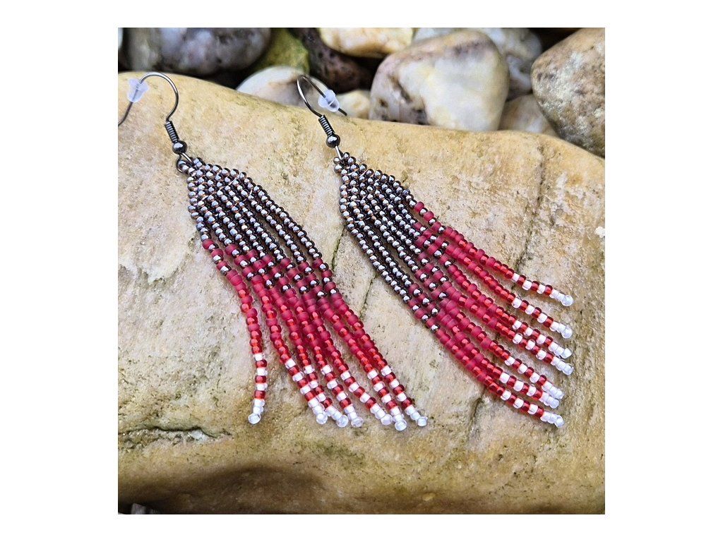 Náušnice mají efektní třásňový tvar, který se při pohybu krásně vlní. Díky použití korálků MIYUKI jsou jednotlivé řady pravidelné a působí velmi precizně. Barevný přechod z tmavé do červené vytváří výrazný, ale stále elegantní dojem.