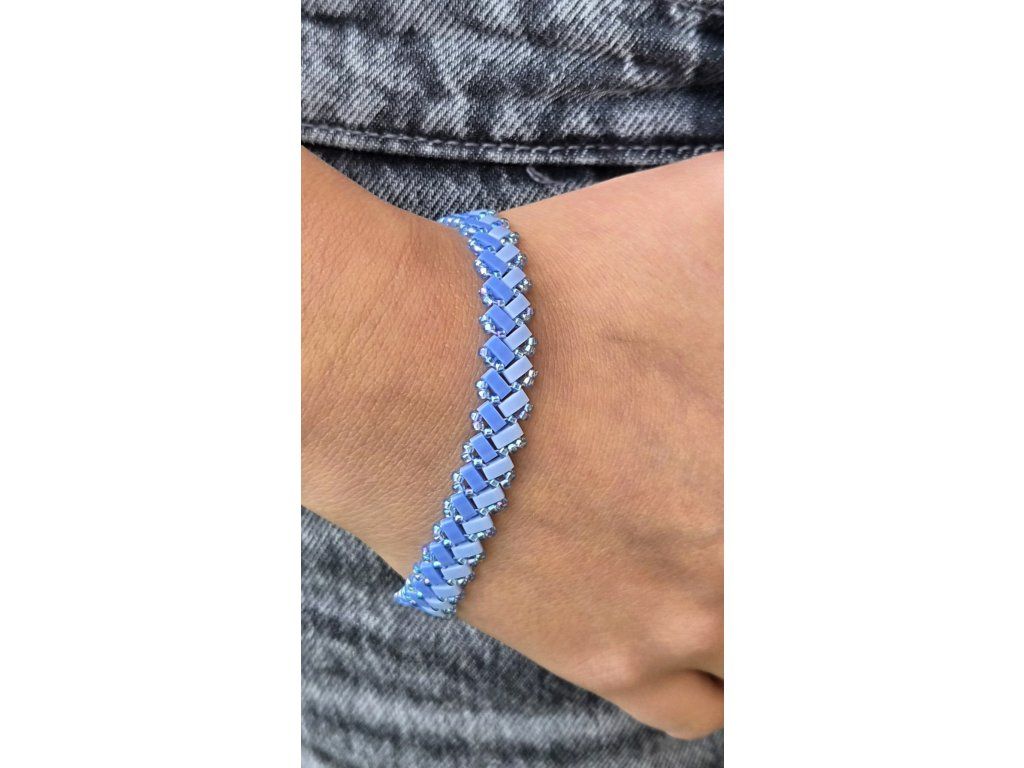 Náramek je laděný do jemných modrých tónů – kombinace světle modré a středně modré vytváří decentní, ale přesto výrazný vzor. Po stranách jsou vsazeny drobné broušené korálky s AB efektem, které při dopadu světla jemně třpytí a dodávají šperku luxusní nádech.