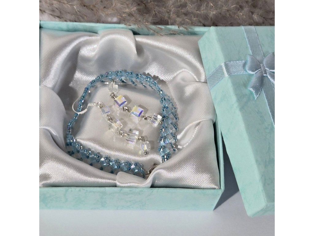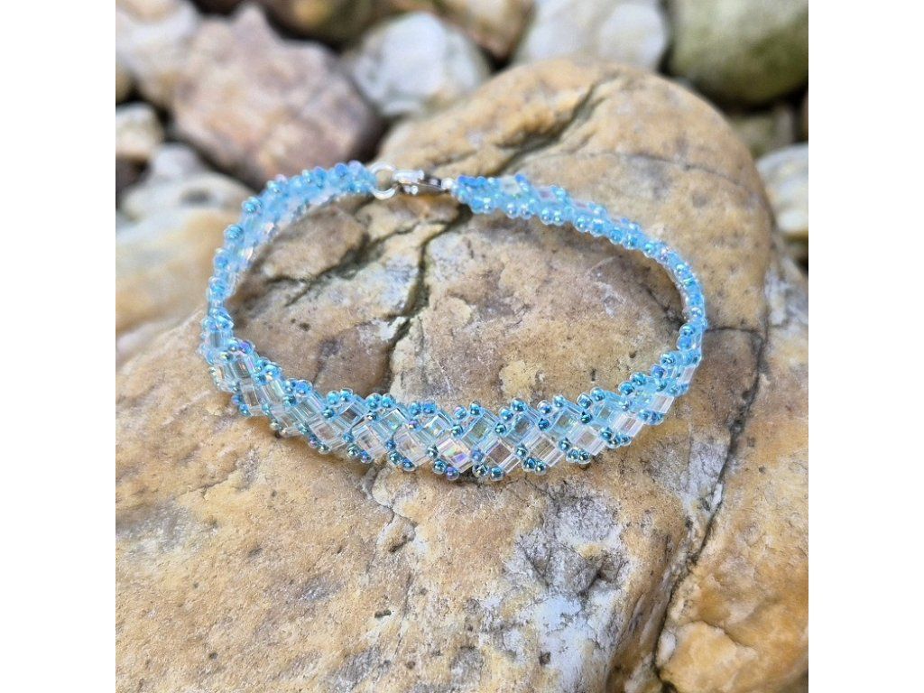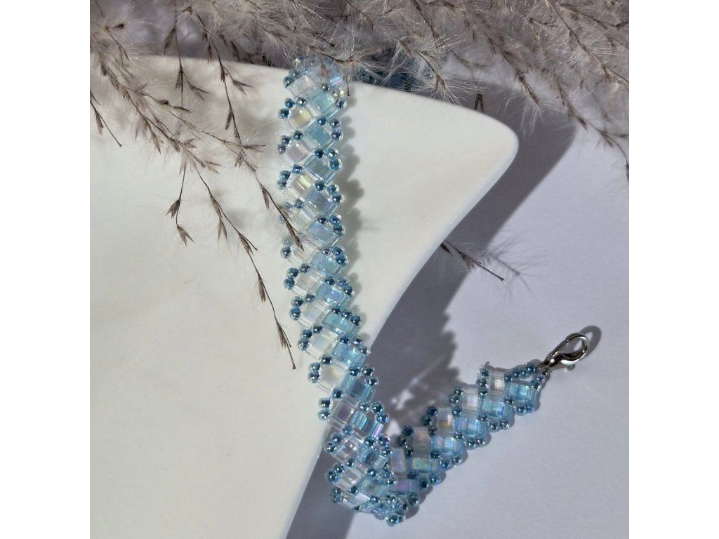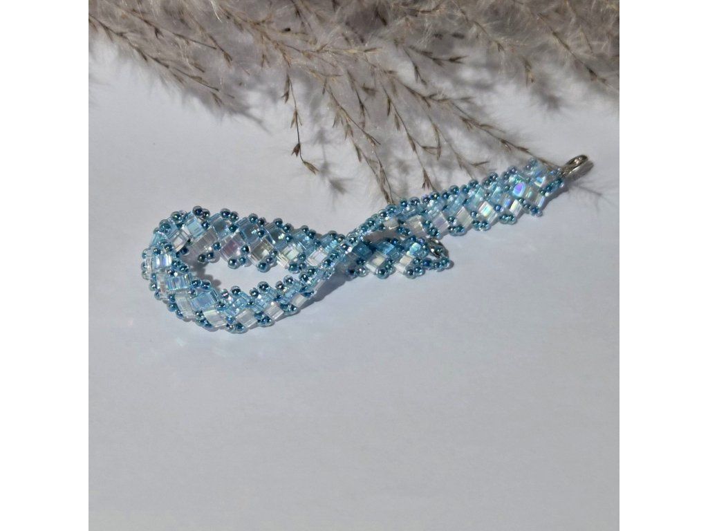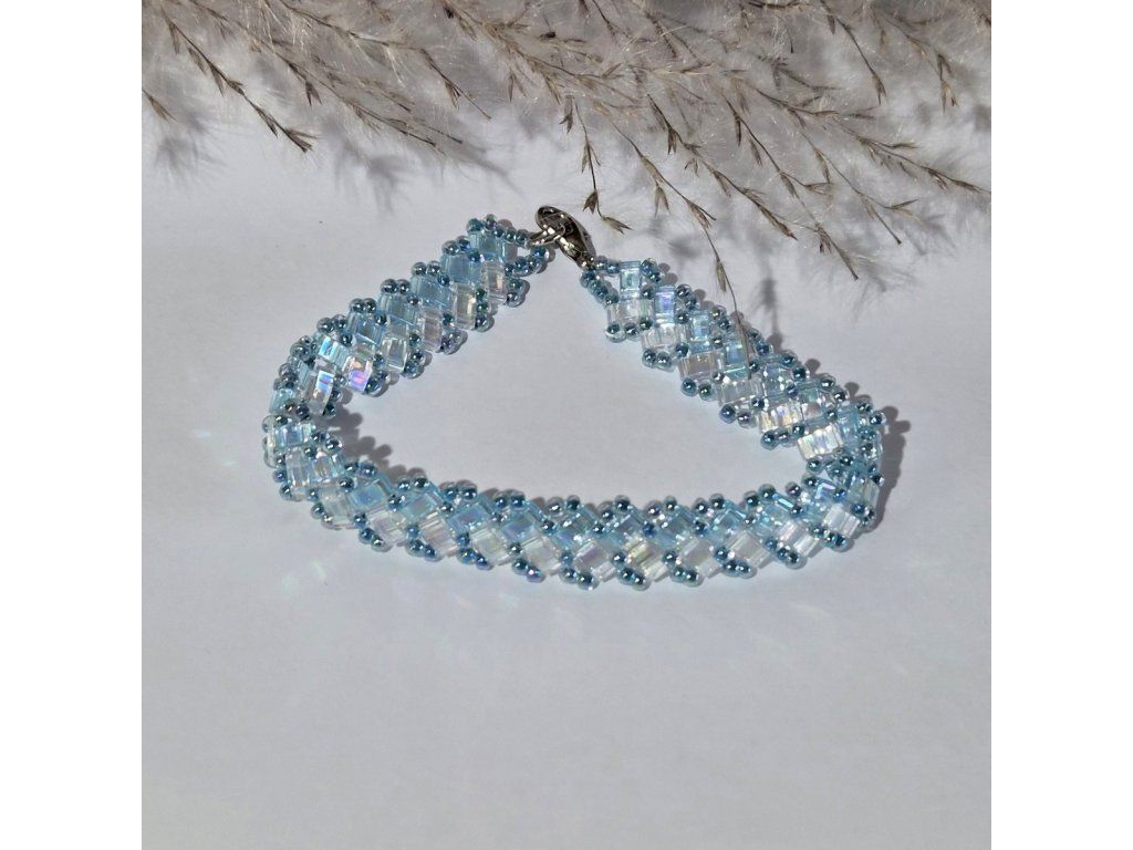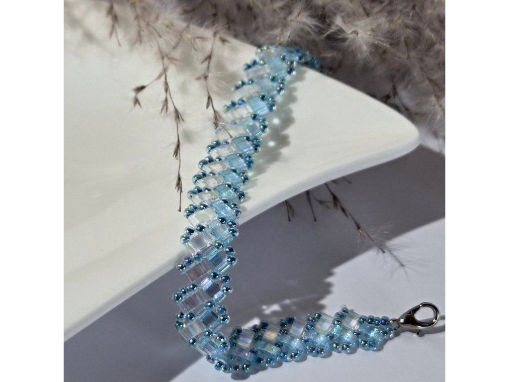 Elegantní ručně vyráběný náramek z japonských korálků MIYUKI, který zaujme svým jemným třpytem a precizním zpracováním. Kombinace průsvitných korálků s irizujícím efektem a drobných modrých korálků vytváří krásný, pravidelný vzor, který působí velmi elegantně a zároveň moderně.