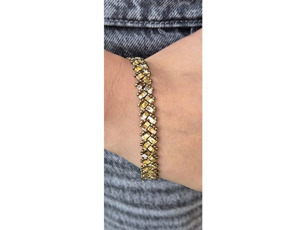 Po stranách jsou použity drobné kovově lesklé korálky ve zlatém odstínu, které dodávají náramku výrazný třpyt a krásně zvýrazňují plastický vzor.