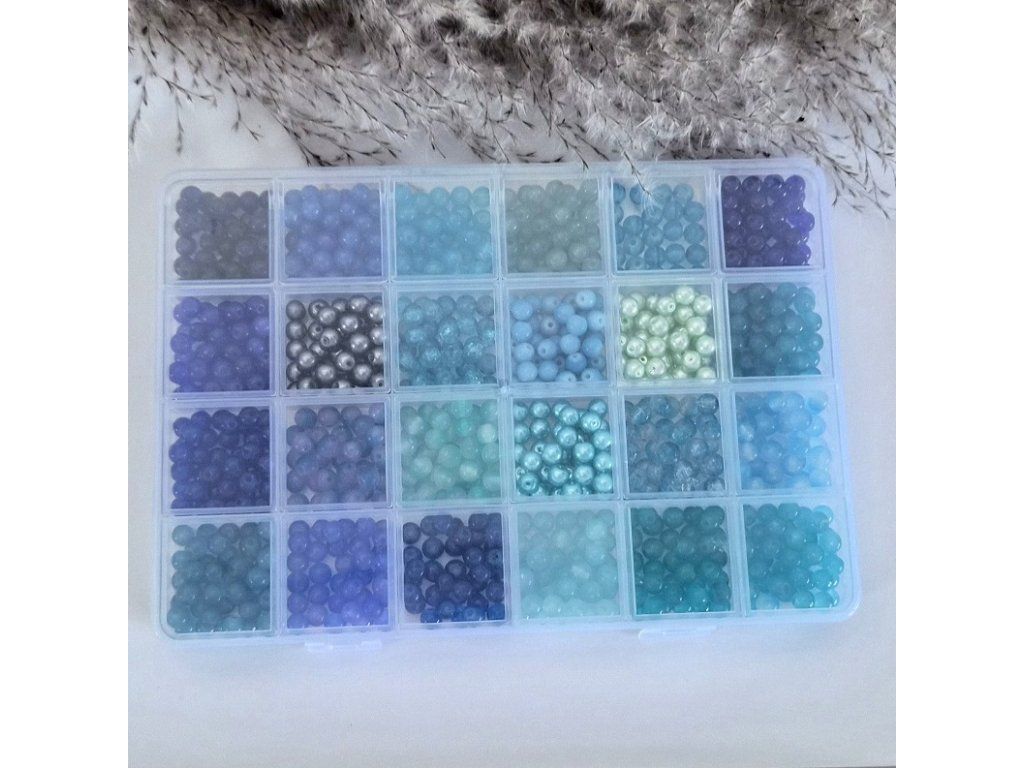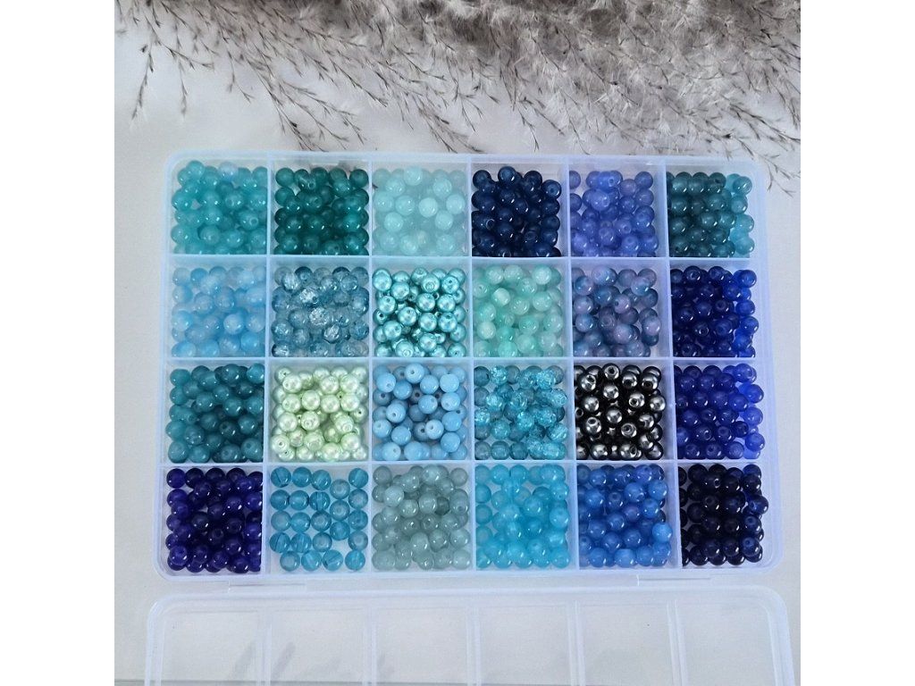 Na fotografii je plastový organizér s víkem, rozdělený do více samostatných přihrádek, které obsahují skleněné korálky o velikosti 6 mm v různých odstínech modré, tyrkysové a zelenomodré barvy. Korálky jsou přehledně roztříděné podle odstínů, což usnadňuje výběr při tvoření.