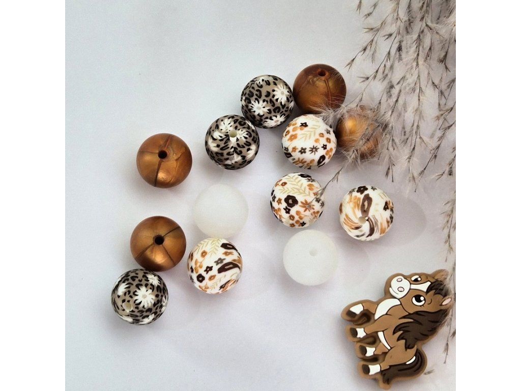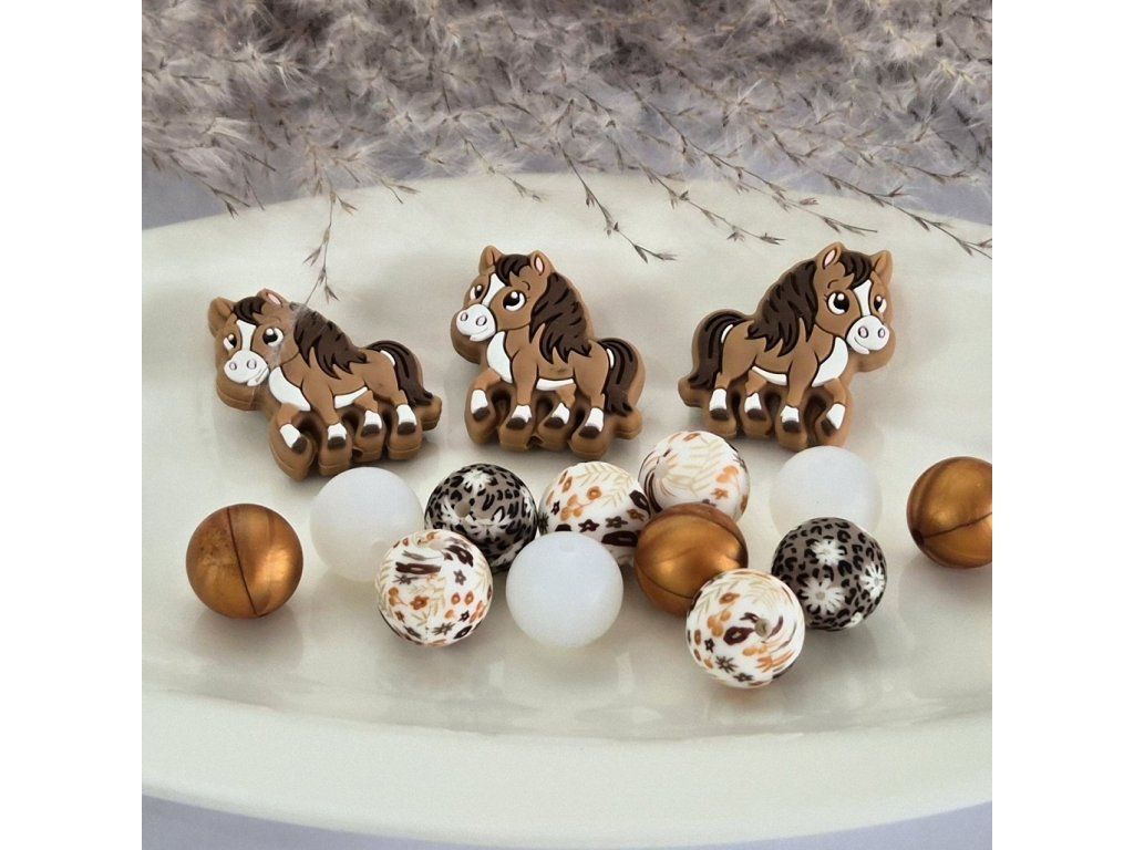 Dekorativní silikonové korálky s motivem koní a přírodními vzory, které jsou ideální pro tvorbu dětských doplňků nebo originálních handmade výrobků. Korálky mají příjemný matný až jemně saténový povrch a jsou lehké a odolné.