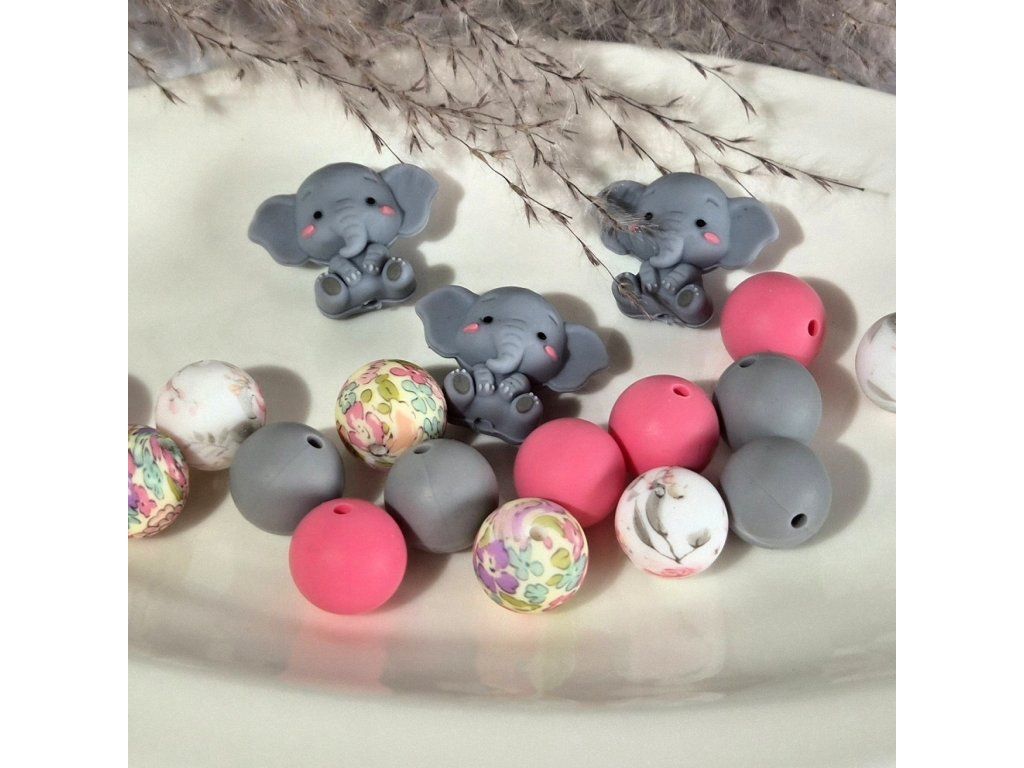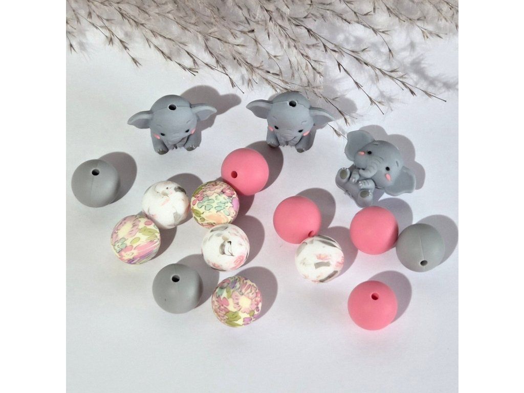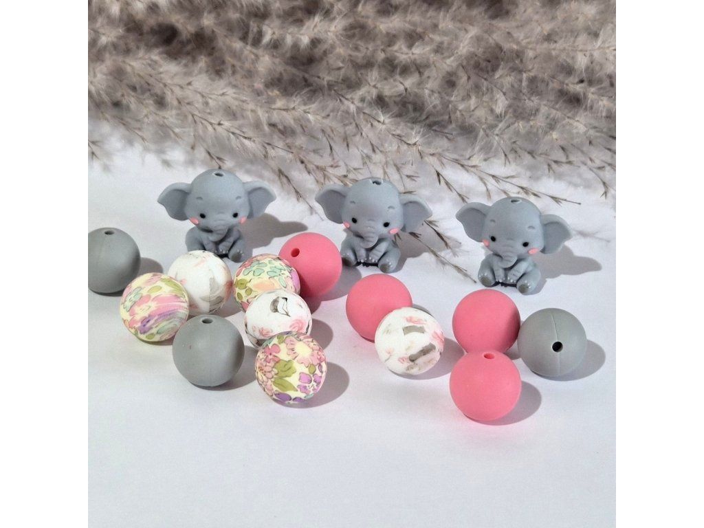 Roztomilý set silikonových korálků v jemných pastelových barvách doplněný o figurky sloníka. Ideální pro tvorbu hravých a něžných doplňků pro děti.