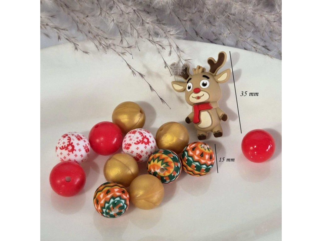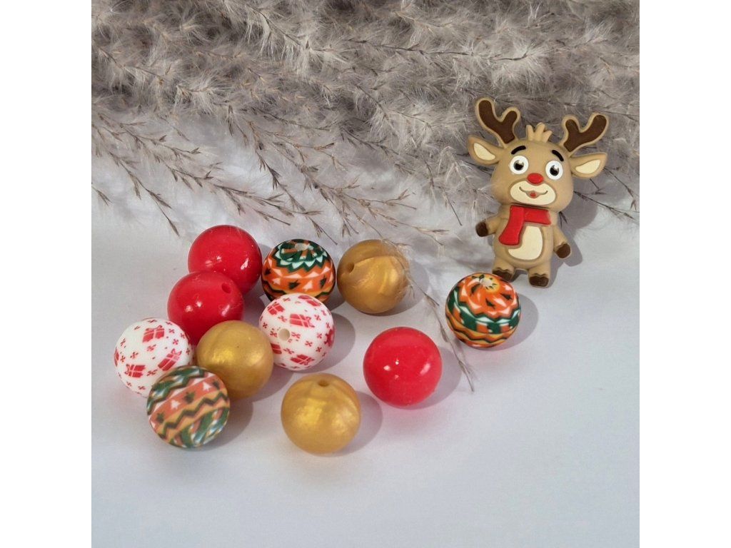 Veselé silikonové korálky s vánoční tematikou v kombinaci červené, zlaté a dekorativních vzorů doplněné o roztomilou figuru sobíka. Ideální pro tvorbu originálních zimních a svátečních doplňků.