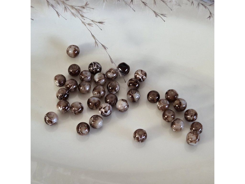Dekorativní skleněné korálky s dvoubarevným mramorovaným vzorem, které vytvářejí elegantní a přirozený vzhled. Kombinace hnědých a béžových odstínů spolu s jemnými světlými liniemi připomíná strukturu přírodního kamene nebo mramoru.
