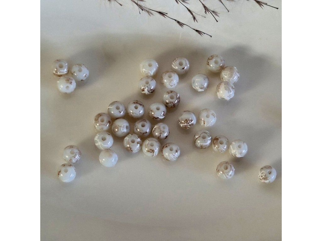 Dekorativní skleněné korálky s jemným mramorovaným vzorem v krémové a světle hnědé barvě, které vytvářejí elegantní a přirozený vzhled. Kombinace světlého základu s jemnými hnědými žilkami a liniemi připomíná strukturu přírodního kamene nebo mramoru.