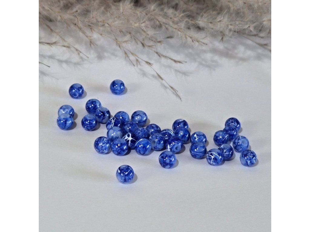 Dekorativní skleněné korálky v syté modré barvě s mramorovaným vzorem, které vytvářejí elegantní a výrazný vzhled. Kombinace tmavě a světle modrých odstínů s jemnými světlými liniemi připomíná strukturu mramoru nebo přírodního kamene.