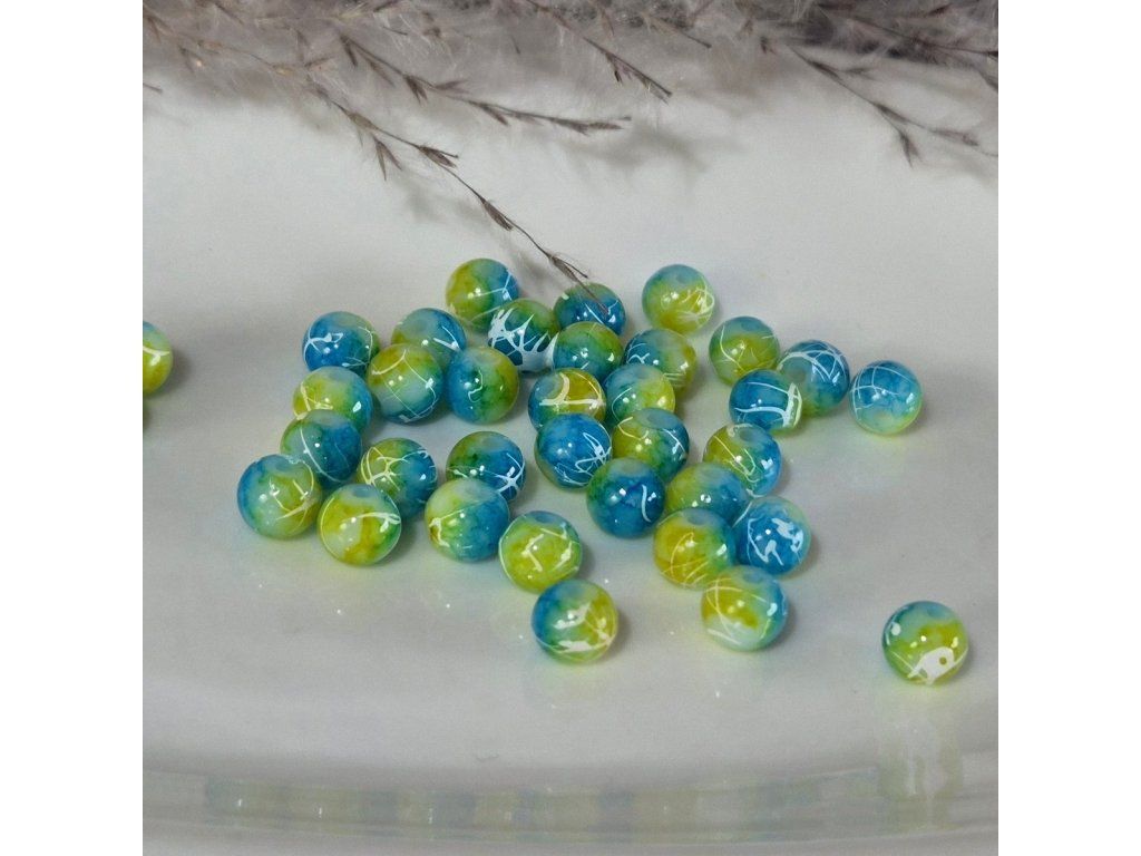 Dekorativní skleněné korálky v kombinaci modré a zelené barvy s mramorovaným vzorem, které vytvářejí svěží a originální vzhled. Barevné přechody mezi tyrkysově modrou a světle zelenou doplňují jemné světlé linie připomínající strukturu mramoru nebo přírodního kamene.