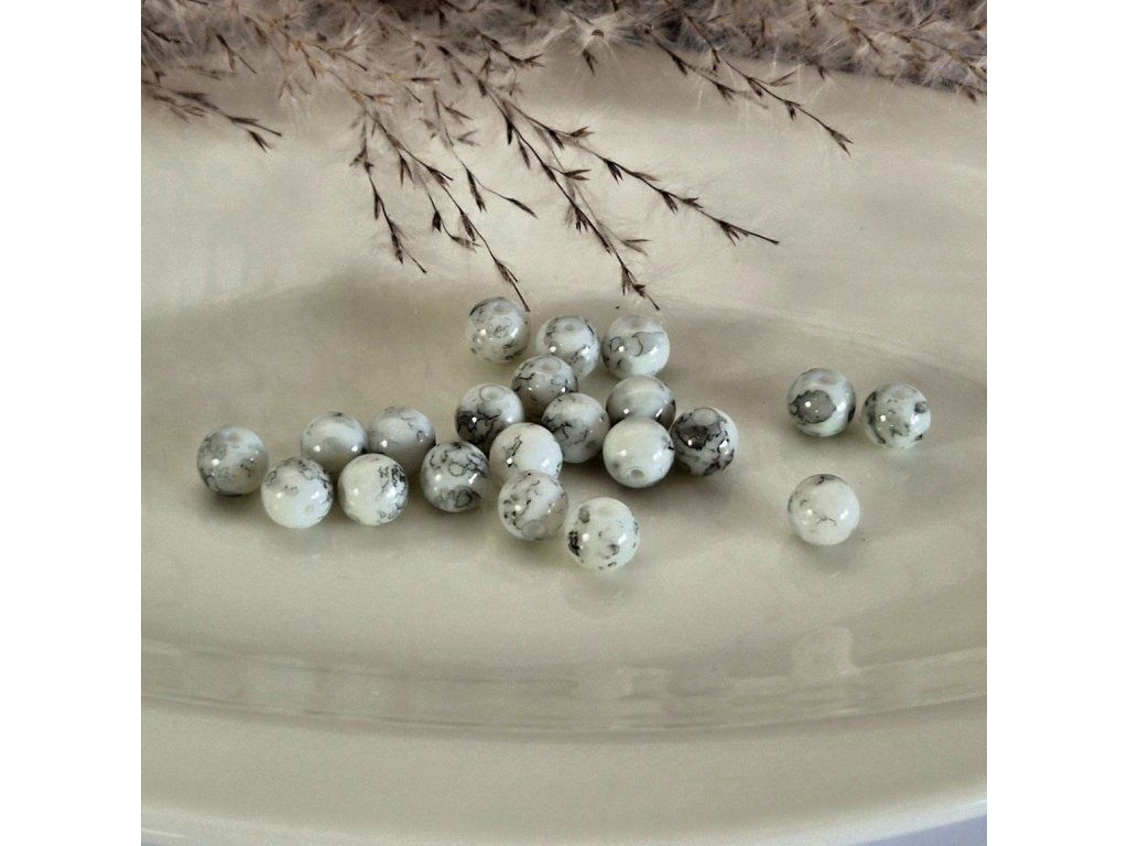 Skleněné korálky – bílý mramorový efekt (8 mm)