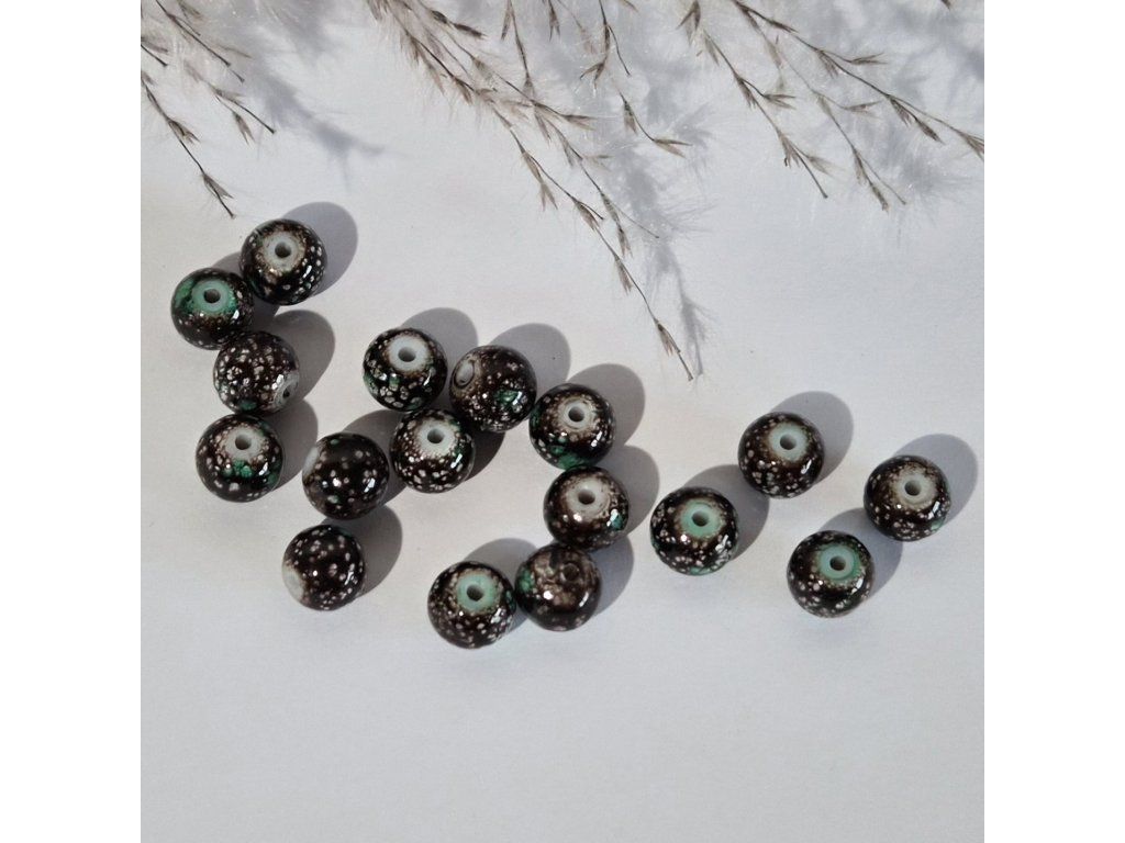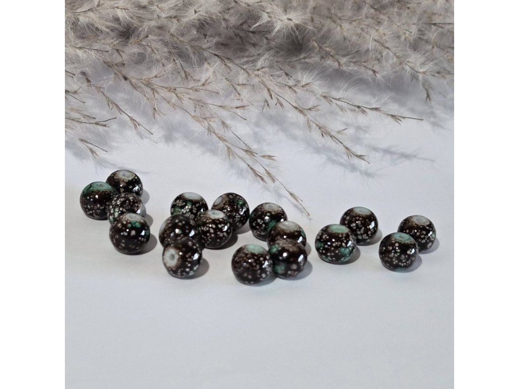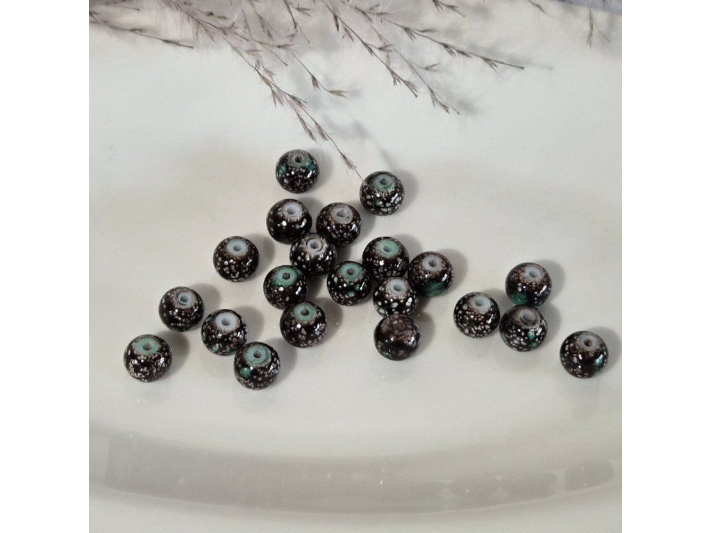 Dekorativní skleněné korálky v tmavě hnědé barvě s jemným mramorovým efektem a drobnými světlejšími vzory. Kombinace tmavého základu, světlých teček a nazelenalých detailů vytváří zajímavý vzhled připomínající přírodní minerál.