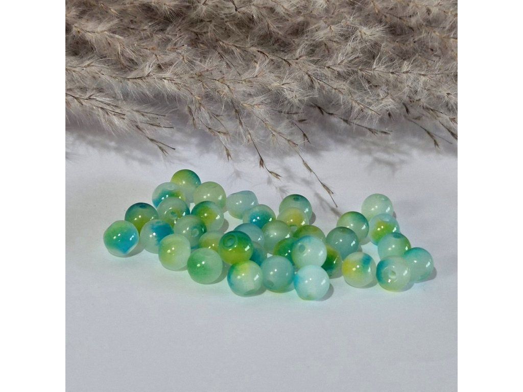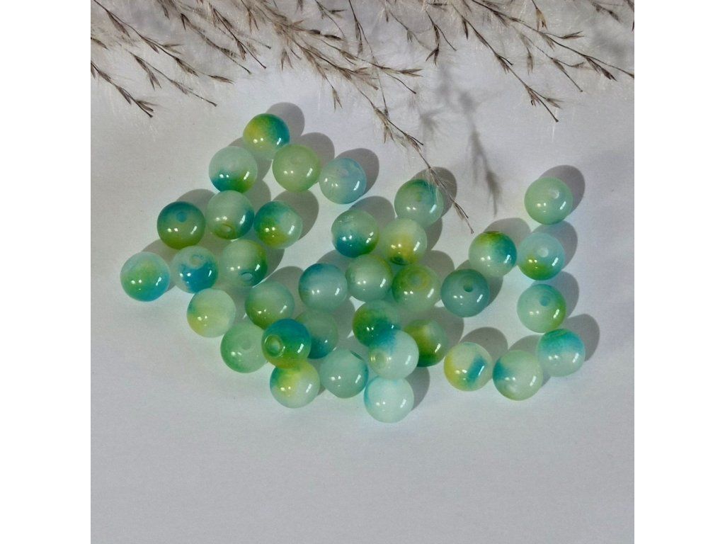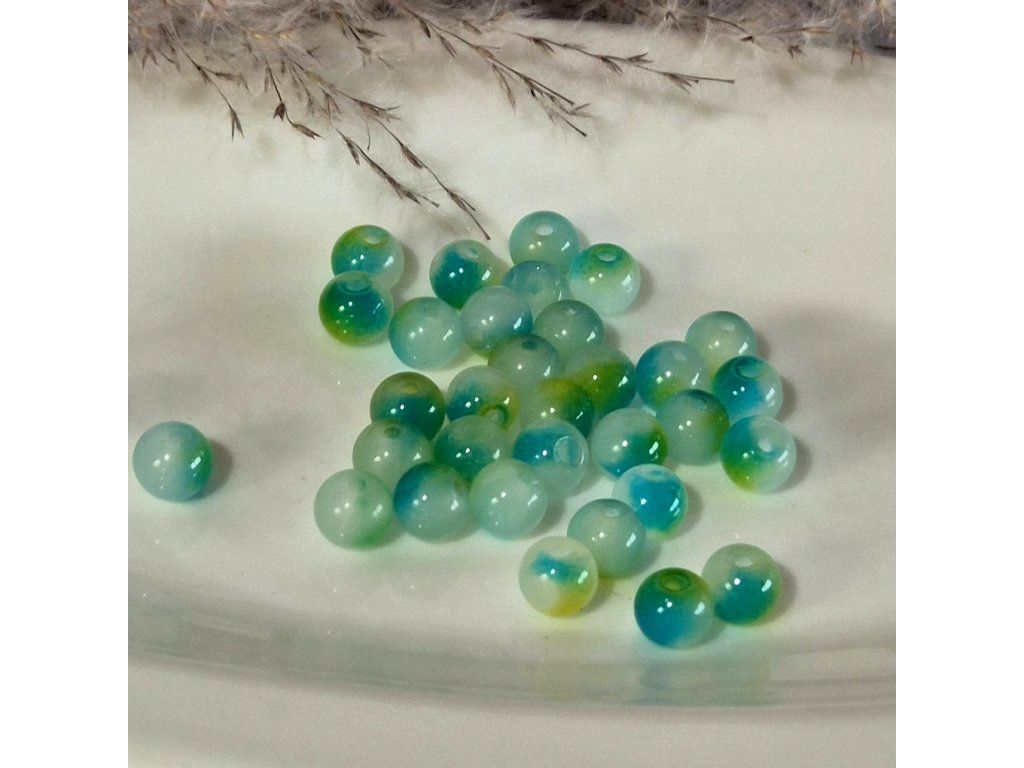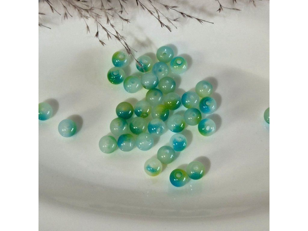 Dekorativní skleněné korálky v kombinaci modré, zelené a jemně mléčné barvy s efektem připomínajícím mramorování. Barevné přechody vytvářejí zajímavý přírodní vzor, díky kterému působí každý korálek originálně a jedinečně.