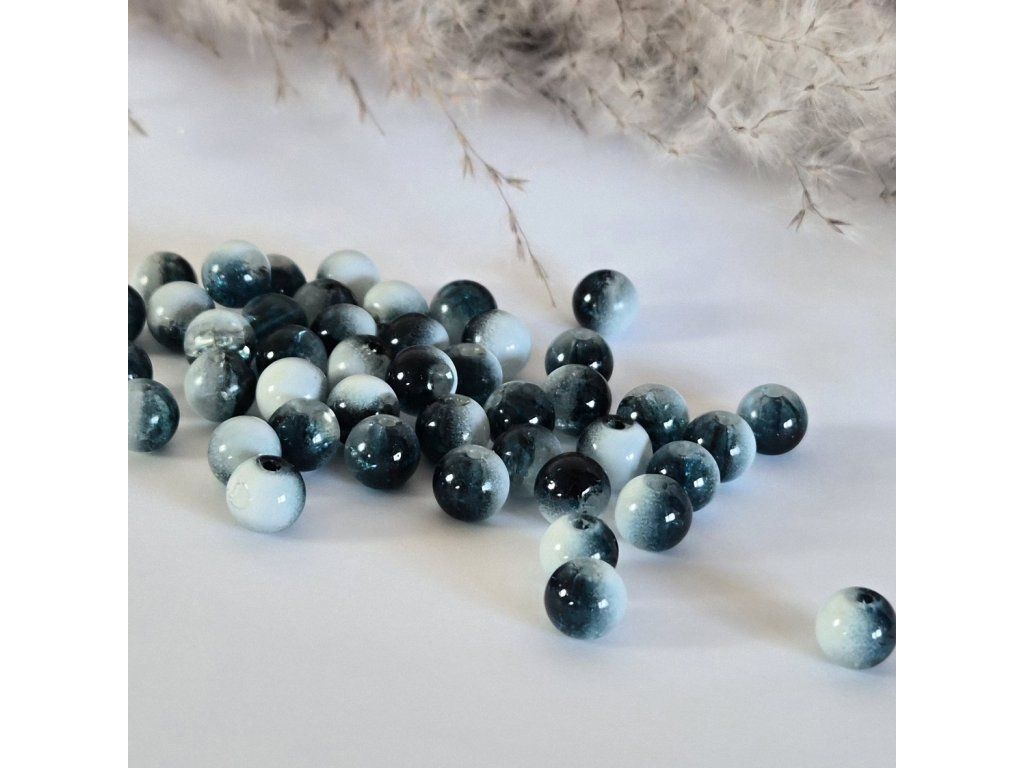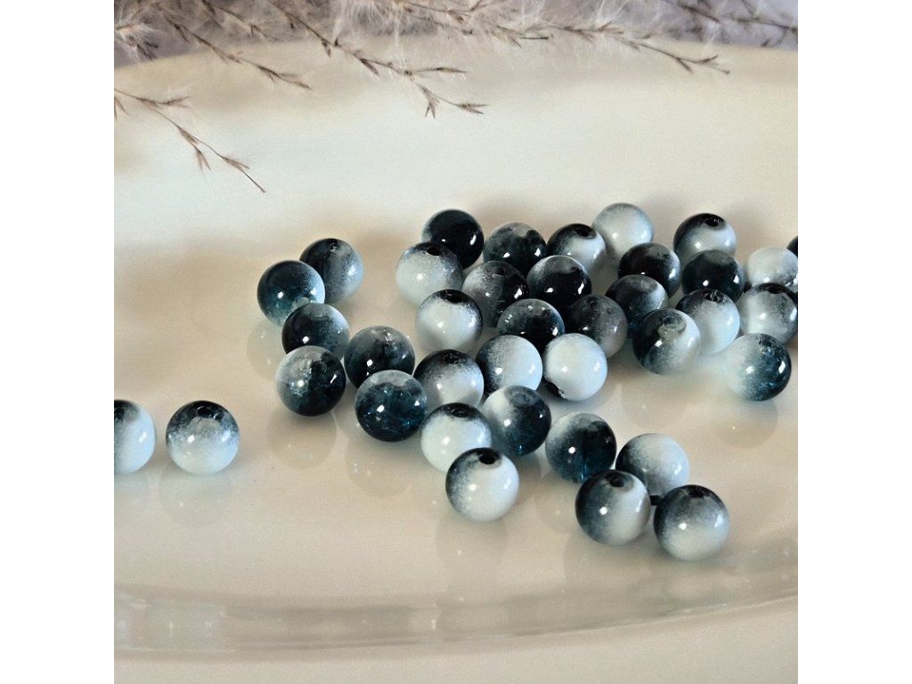Elegantní skleněné korálky o průměru 8 mm v kombinaci bílé a hluboké modro-inkoustové barvy. Mix plných, poloprůsvitných i crackle provedení vytváří zajímavý kontrast a jemnou hru světla. Lesklý glazovaný povrch zvýrazňuje barevné přechody i vnitřní strukturu korálků.