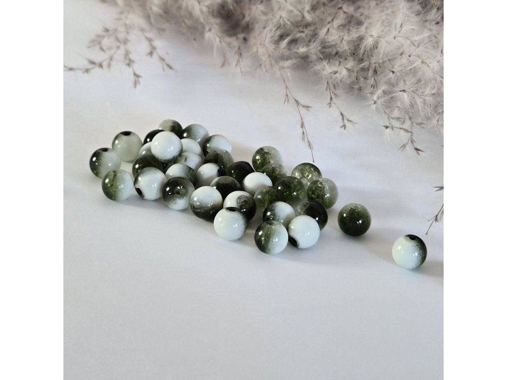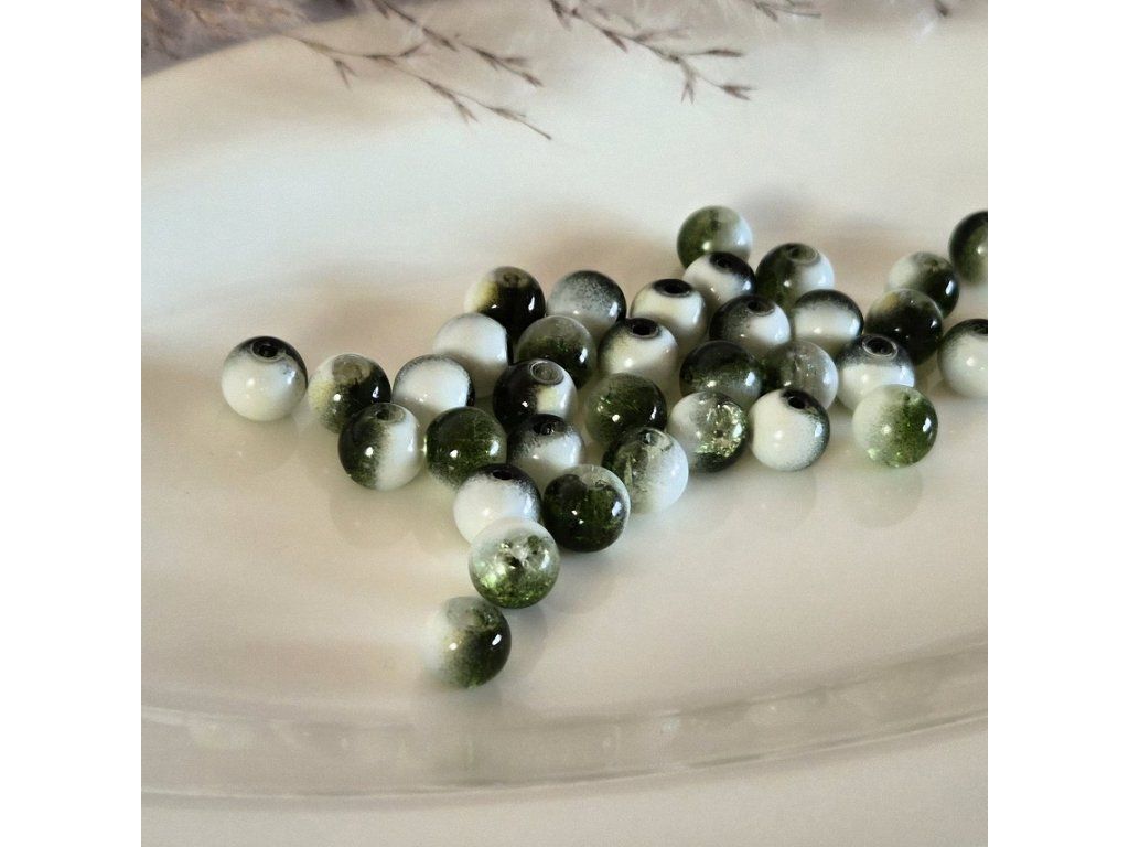 Skleněné korálky Ø 8 mm – zeleno-bílý mix s glazovaným a crackle efektem