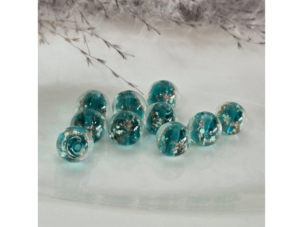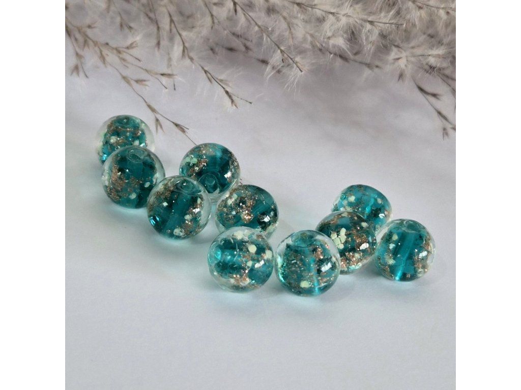 Originální skleněné korálky s efektem svícení ve tmě (glow in the dark) doplněné o dekorativní třpytky a barevné jádro. Na světle zaujmou svým leskem a po nasvícení ve tmě jemně září.