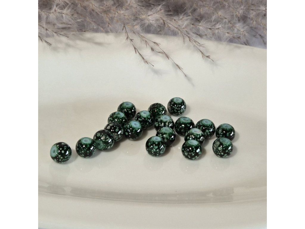 Dekorativní skleněné korálky v tmavě zelené barvě s jemným mramorovým efektem a drobnými světlejšími vzory. Kombinace hlubokého zeleného odstínu a světlých teček vytváří zajímavý vzhled připomínající přírodní kámen.