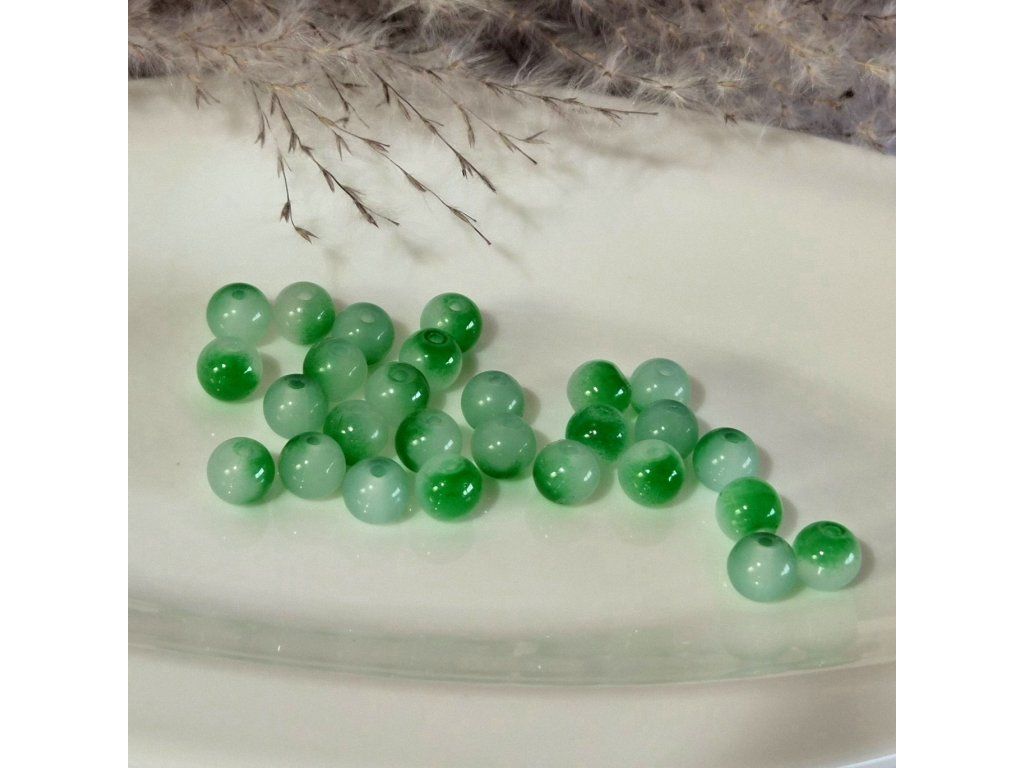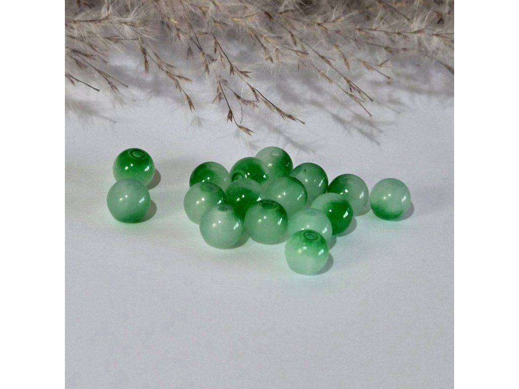 Dekorativní skleněné korálky v kombinaci světlé mléčné a sytě zelené barvy, které vytvářejí jemný barevný přechod uvnitř korálku. Tento efekt dodává korálkům zajímavý a přirozený vzhled, díky kterému působí velmi svěže a elegantně.