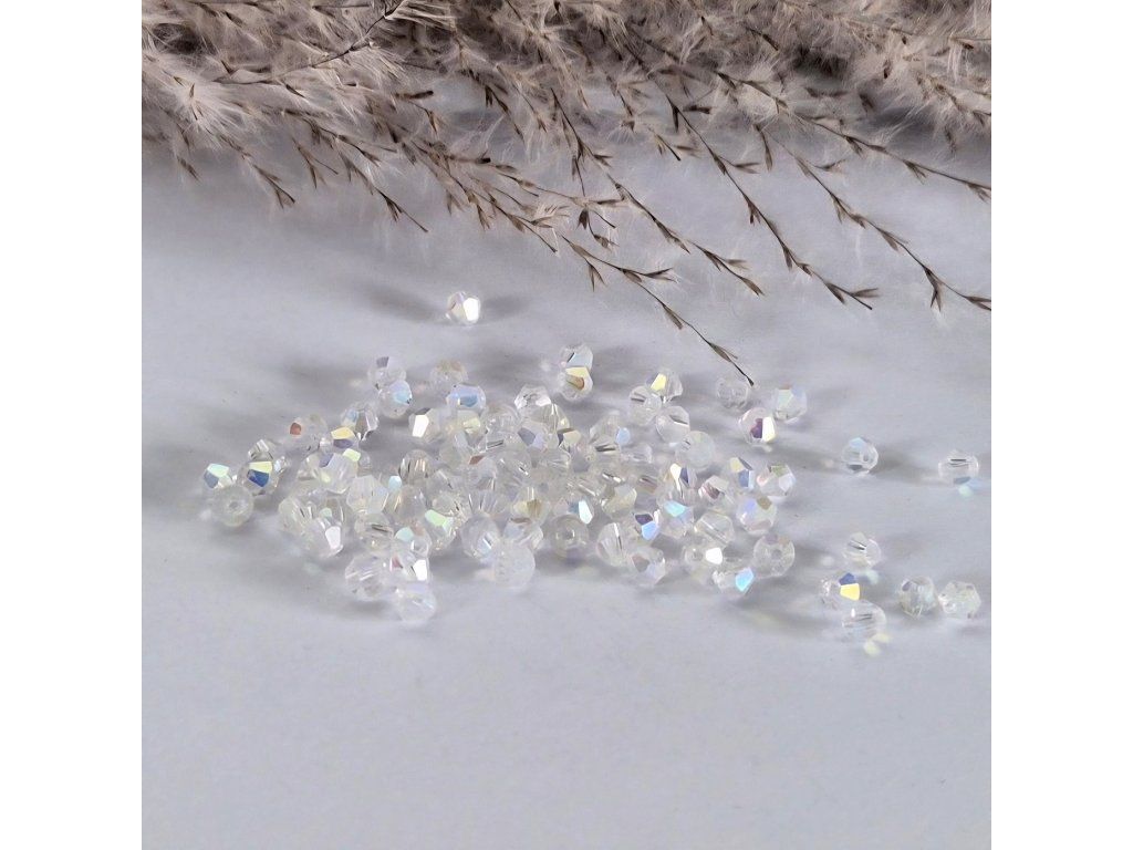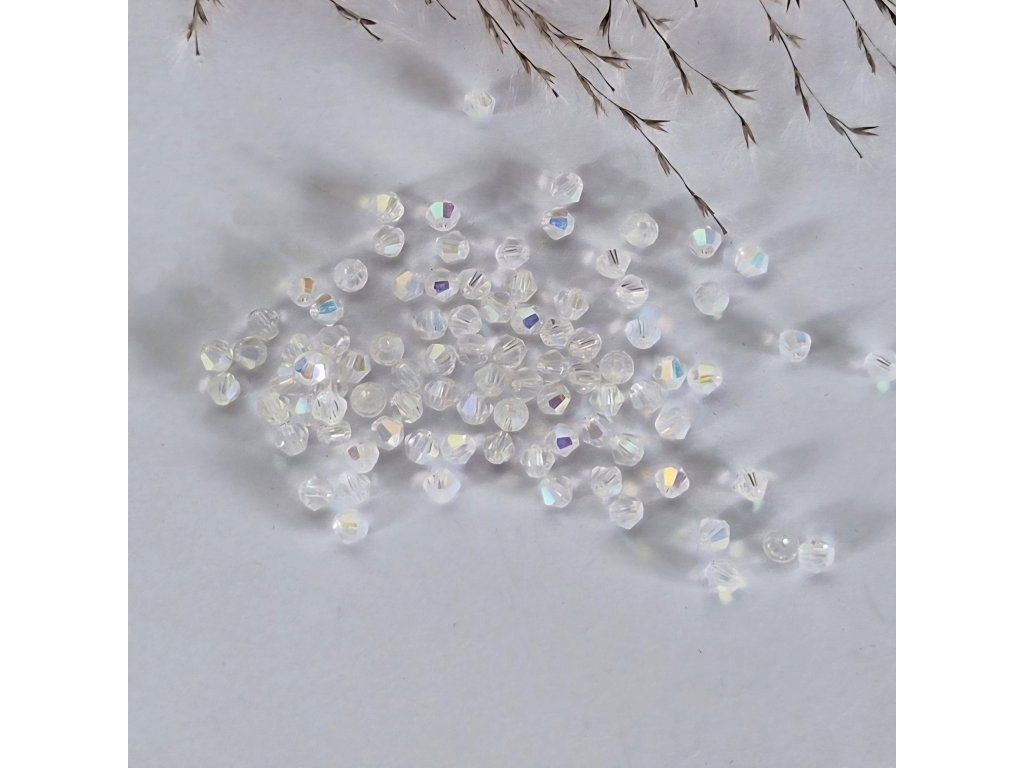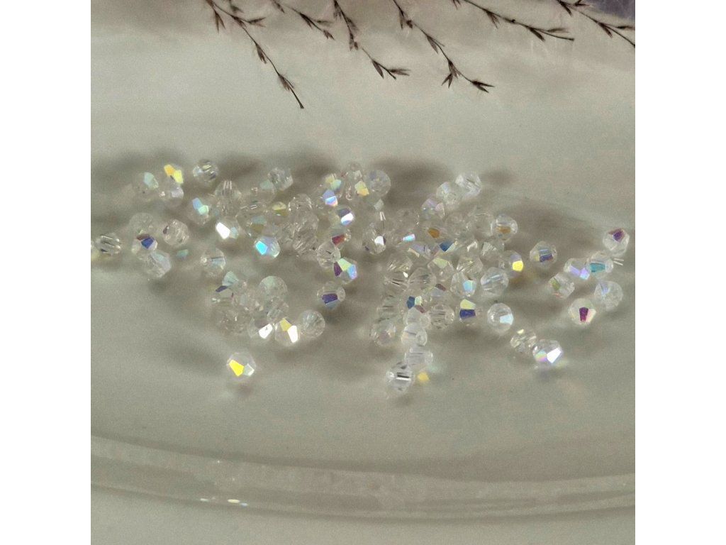Jemné rakouské skleněné korálky s precizním broušením, které vytvářejí krásný třpyt a odlesky světla. Transparentní sklo s AB (Aurora Borealis) efektem dodává korálkům duhový lesk v odstínech modré, růžové a zlaté.