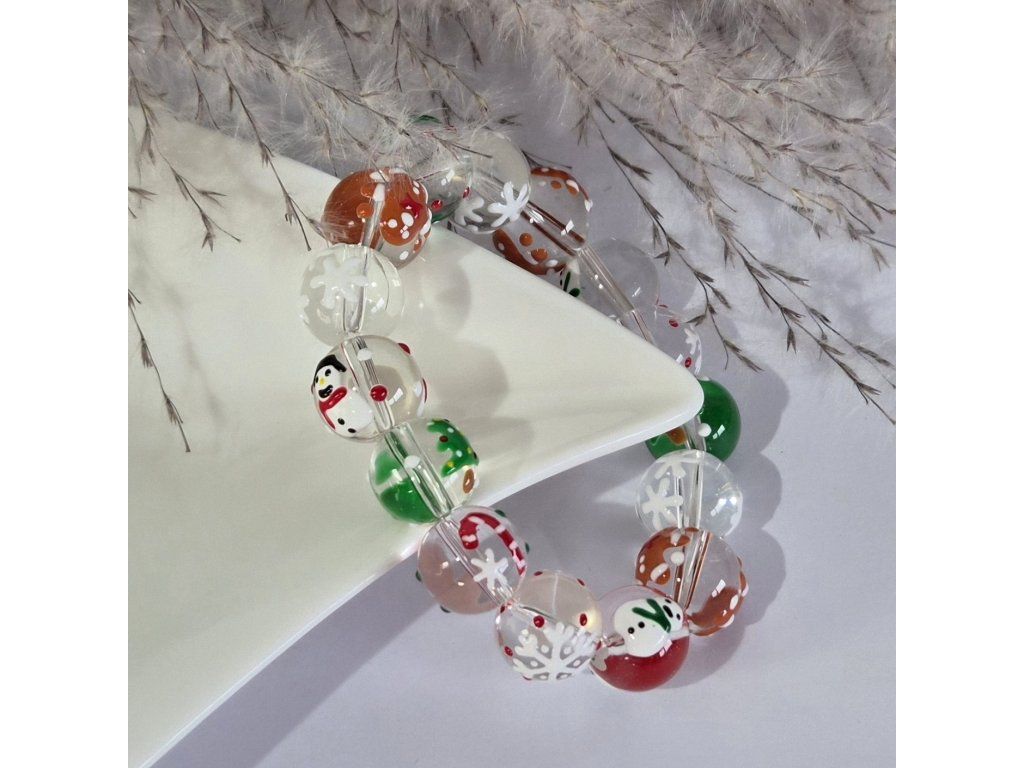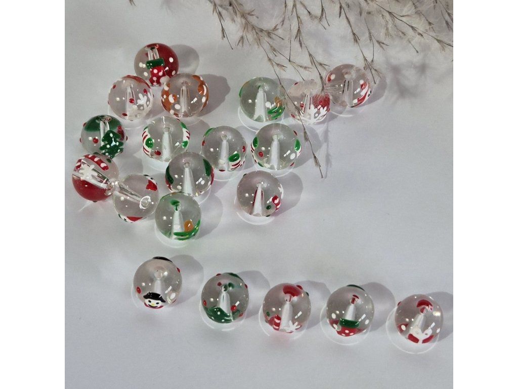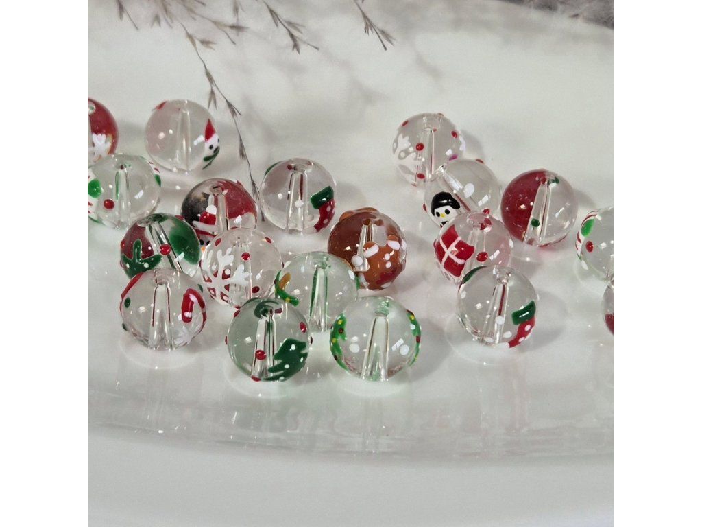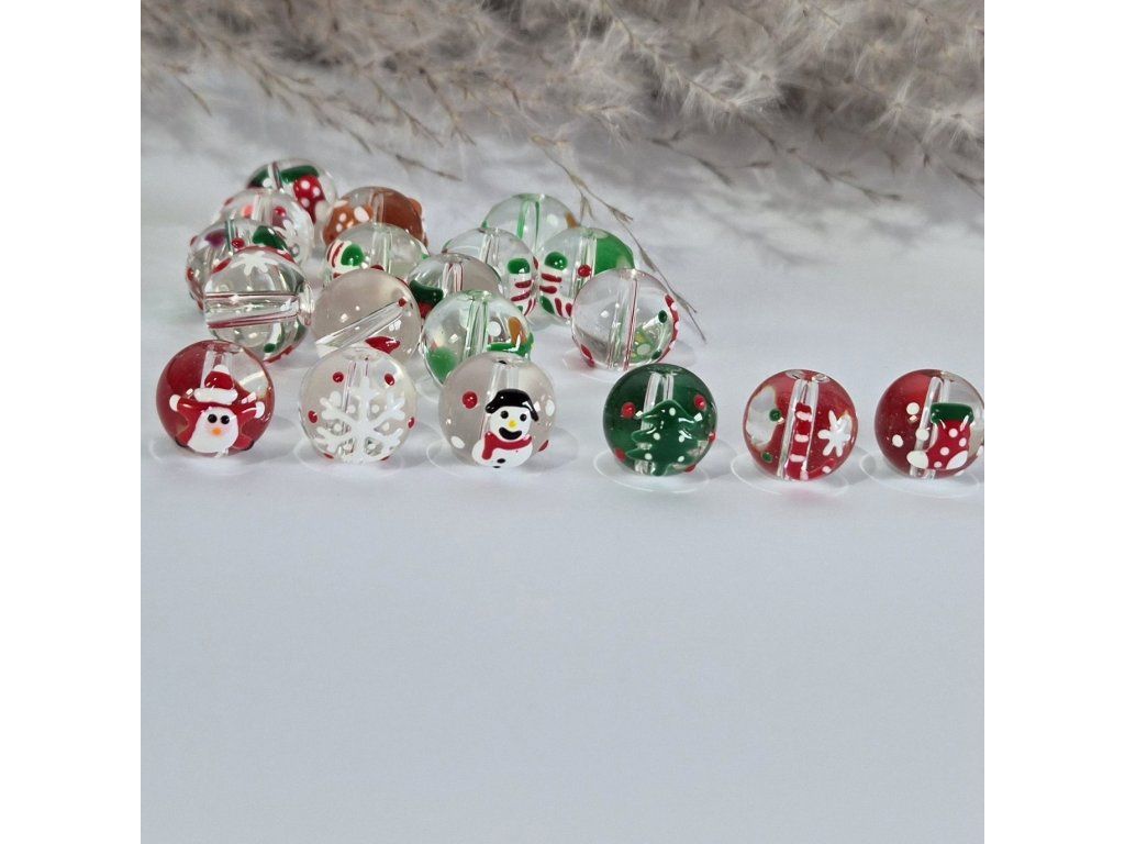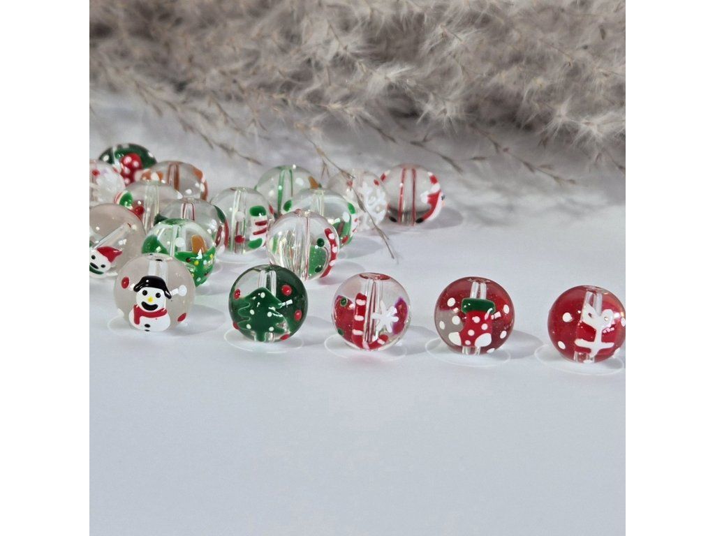 Krásné skleněné korálky s ruční malbou v tradičních vánočních motivech. Každý korálek zdobí detailní ilustrace jako sněhulák, vločka, stromek nebo punčocha, které dodají výrobkům jedinečný a sváteční charakter.
