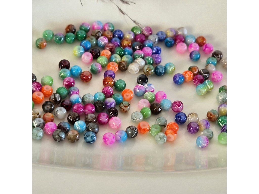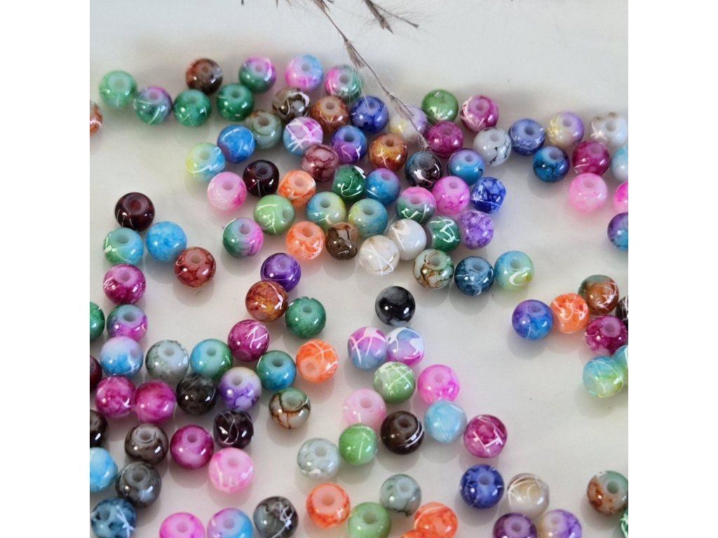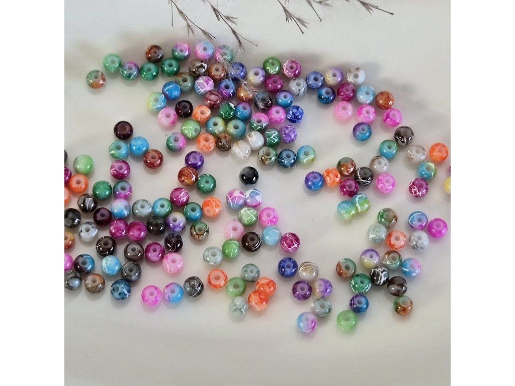 Dekorativní skleněné korálky s keramickým vzorem v různých barvách, které vytvářejí výrazný a originální vzhled. Korálky mají pestrý mix barev – od modré, růžové, zelené, oranžové až po neutrální odstíny – doplněný jemnými liniemi a mramorováním připomínajícím keramiku nebo malovaný porcelán.