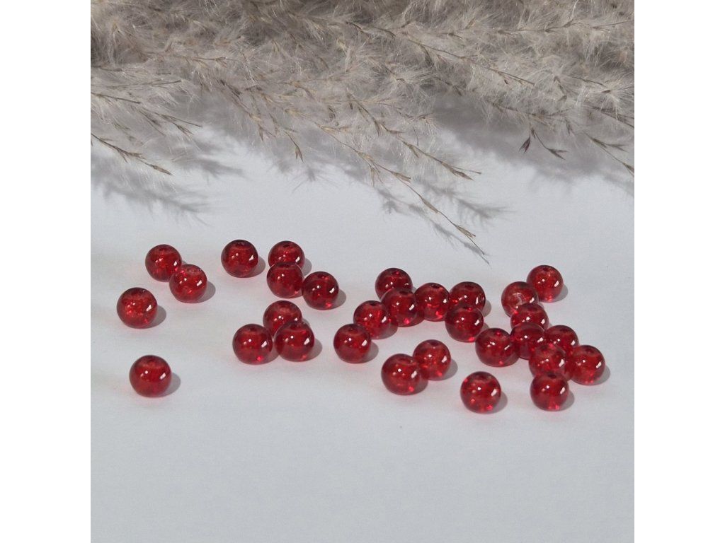 Výrazné skleněné korálky v intenzivní červené barvě s praskajícím (crackle) efektem, který uvnitř vytváří jemné odlesky a třpyt. Díky své sytosti působí velmi živě, energicky a luxusně.