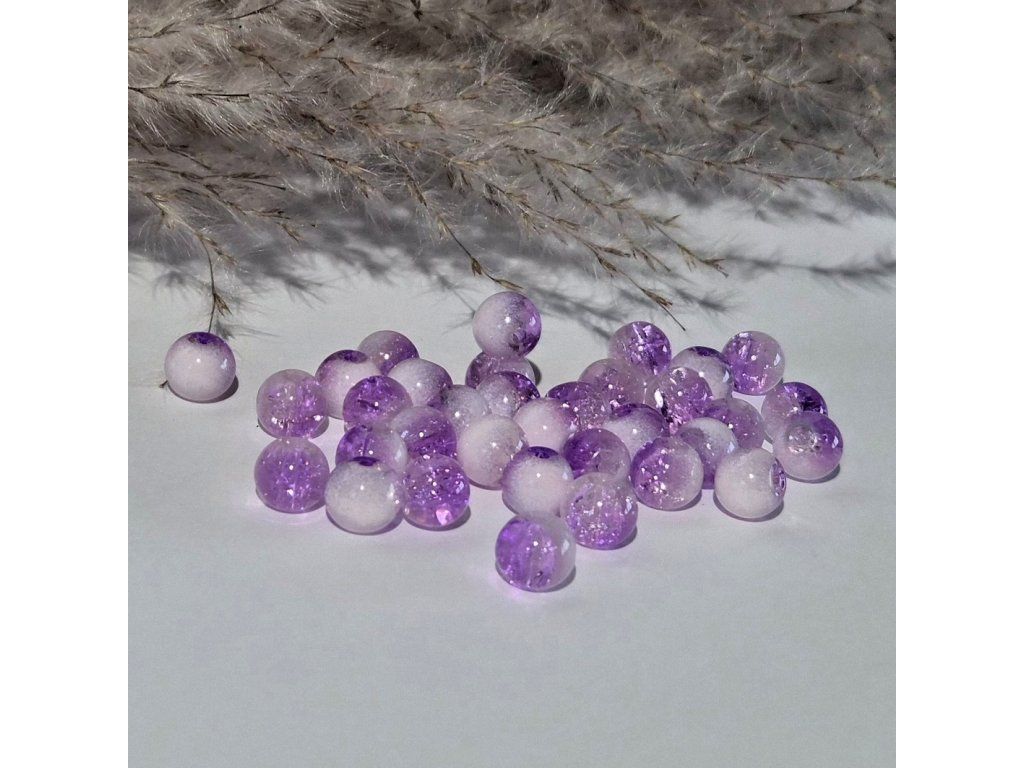 Dekorativní skleněné korálky s praskajícím (crackle) efektem, které vytvářejí krásný třpytivý vzhled. Kombinace jemné bílé barvy s výrazným fialovým odstínem a vnitřním praskajícím vzorem dodává korálkům originální a elegantní charakter.