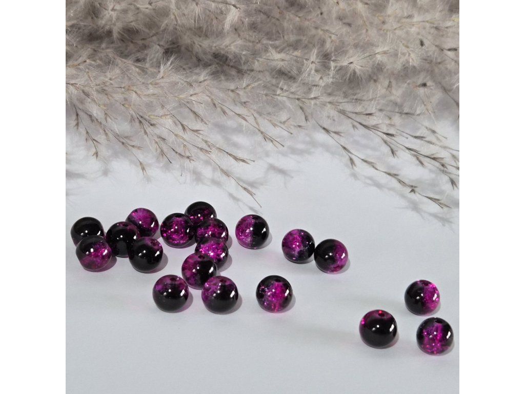 Elegantní a výrazné skleněné korálky v kombinaci černé a sytě fuchsiové barvy, které díky praskajícímu (crackle) efektu krásně odráží světlo a vytváří třpytivý, živý vzhled. Ideální pro šperky, které mají zaujmout na první pohled.