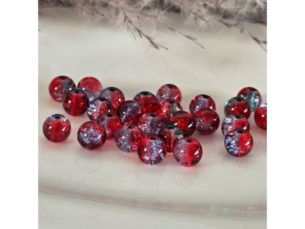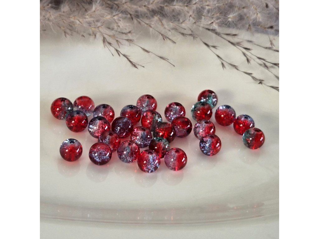 Výrazné skleněné korálky v kombinaci sytě červené a čiré s modrým nádechem, doplněné o praskající (crackle) efekt, který vytváří hluboký třpyt a zajímavou barevnou hru. Působí elegantně, dramaticky a moderně.