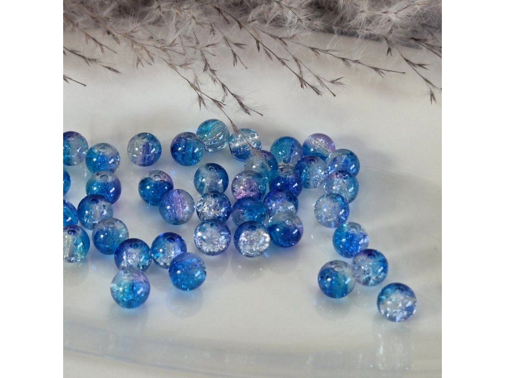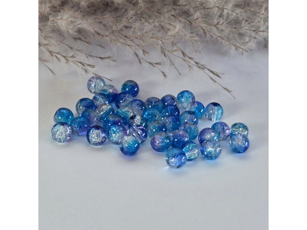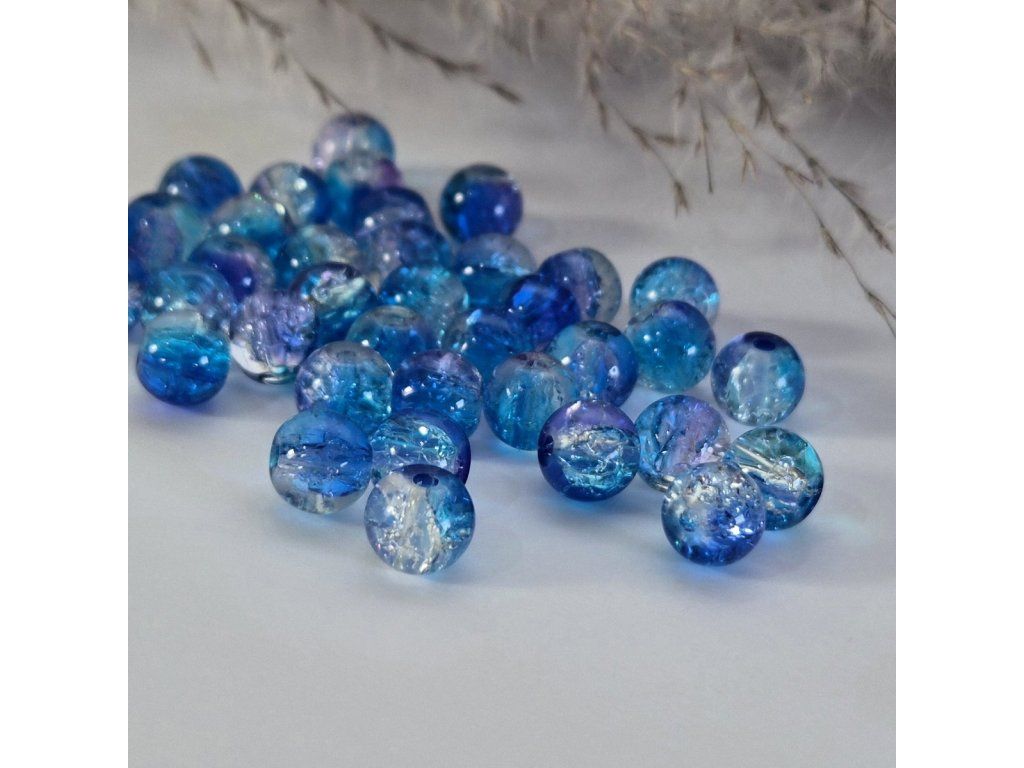 Dekorativní skleněné korálky v odstínech modré, tyrkysové a jemně fialové s atraktivním praskajícím efektem uvnitř. Speciální úprava skla vytváří jemnou strukturu připomínající ledové praskliny, které krásně odrážejí světlo a dodávají korálkům jedinečný třpytivý vzhled.